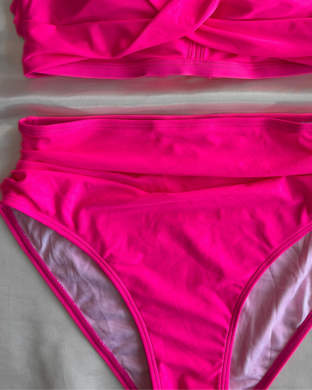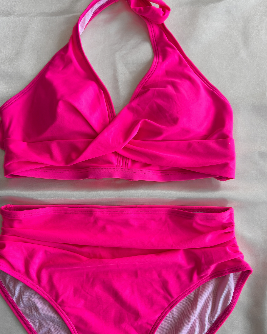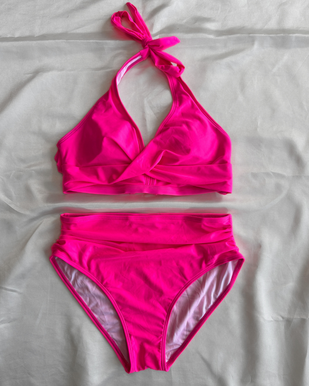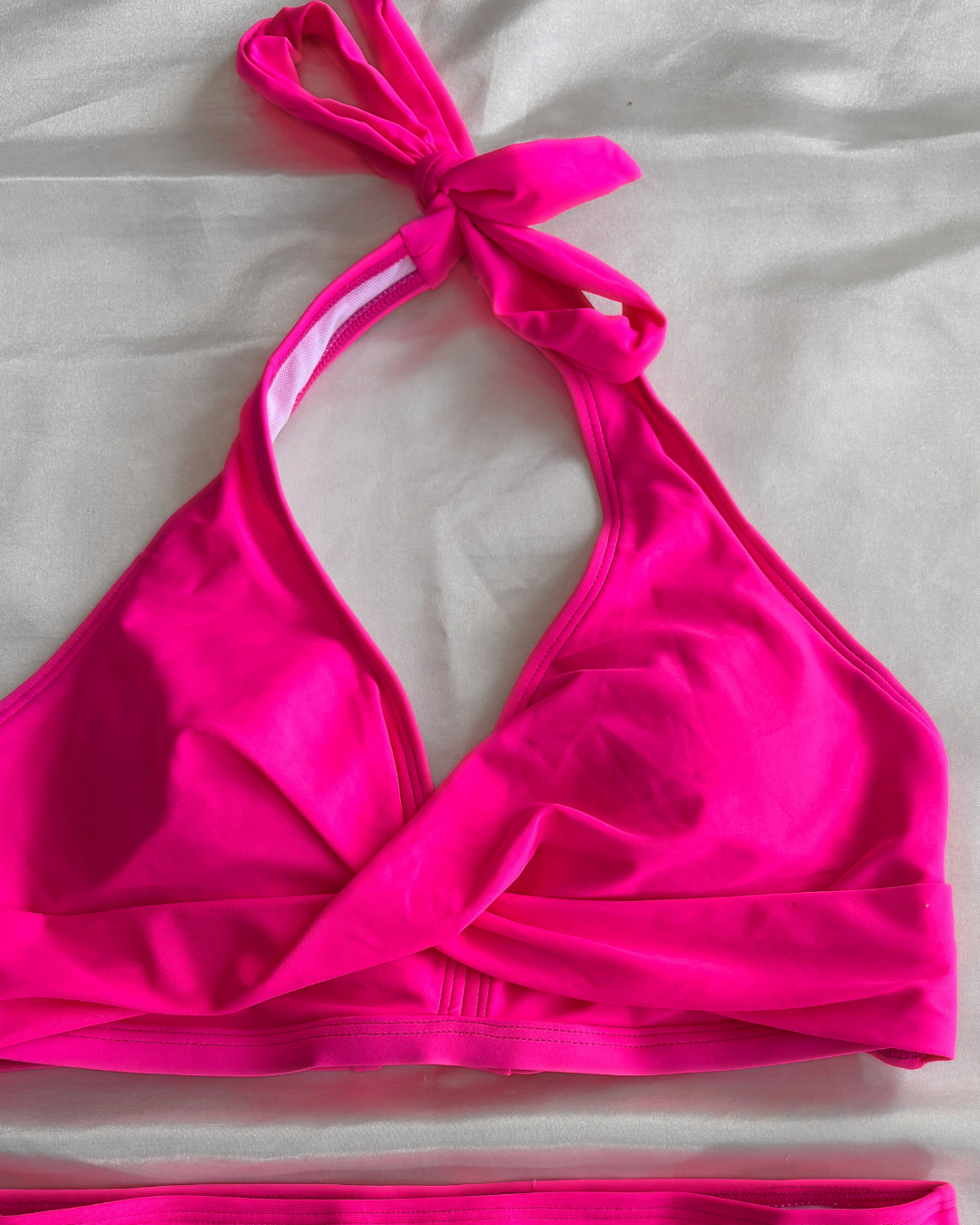 Bikini con copas, cuello halter ajustable y calzón de tiro alto.