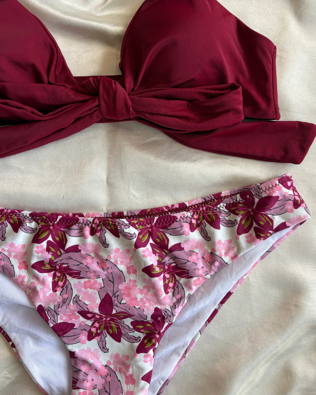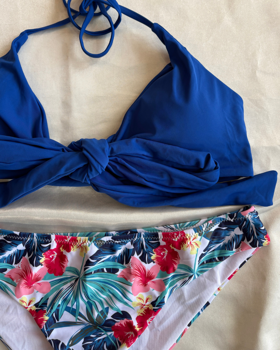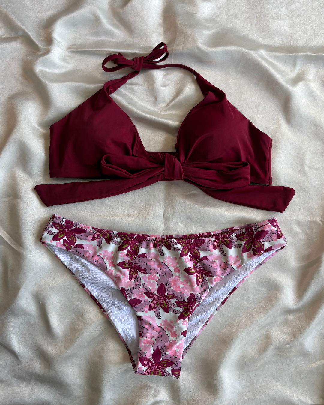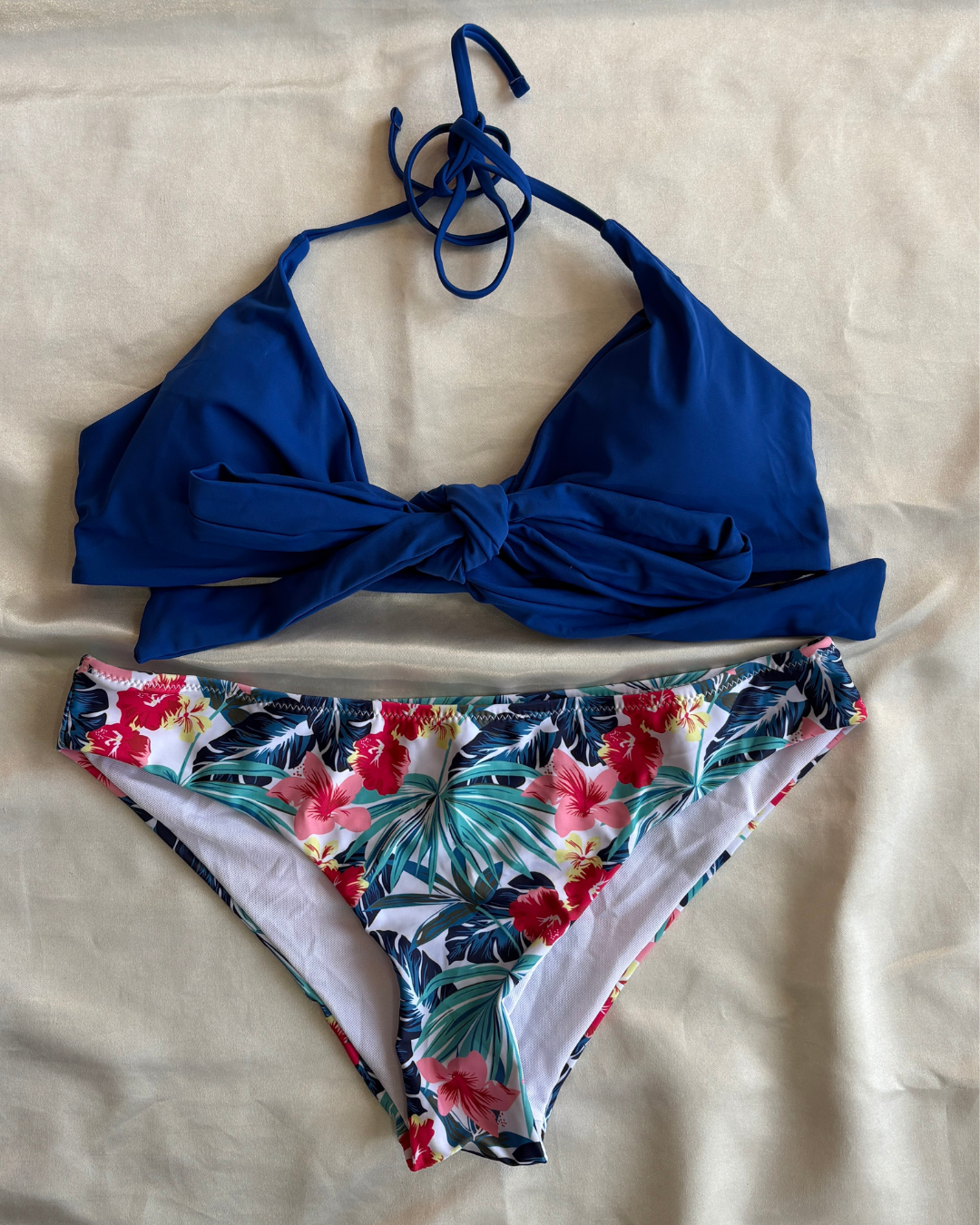 Bikini confeccionado en licra, con copas, cuello halter y calzón corte pequeño con estampado florar.