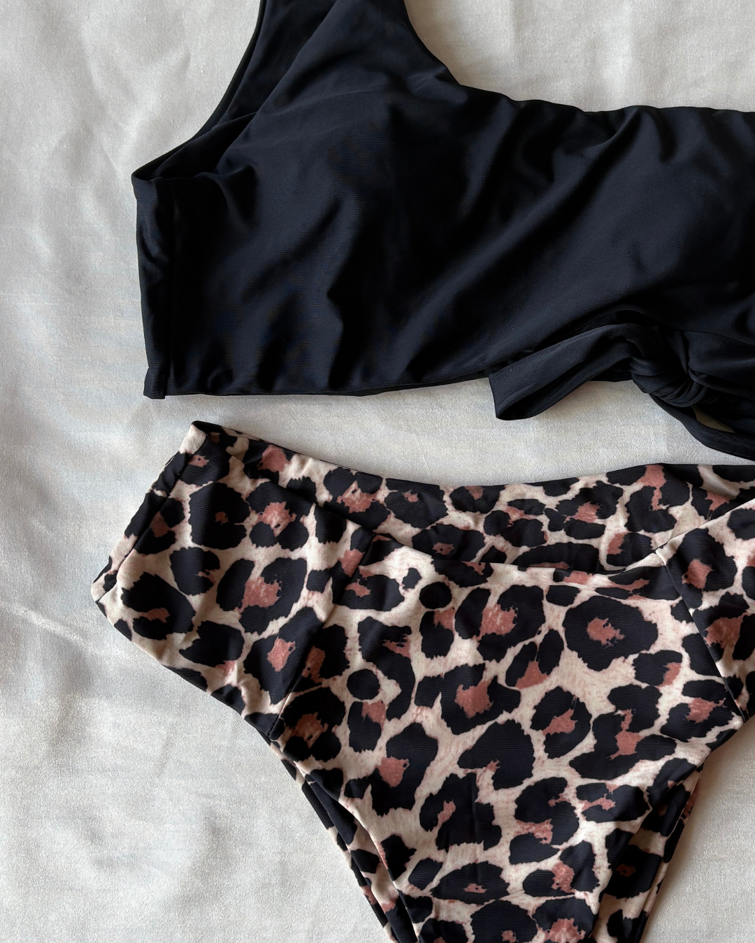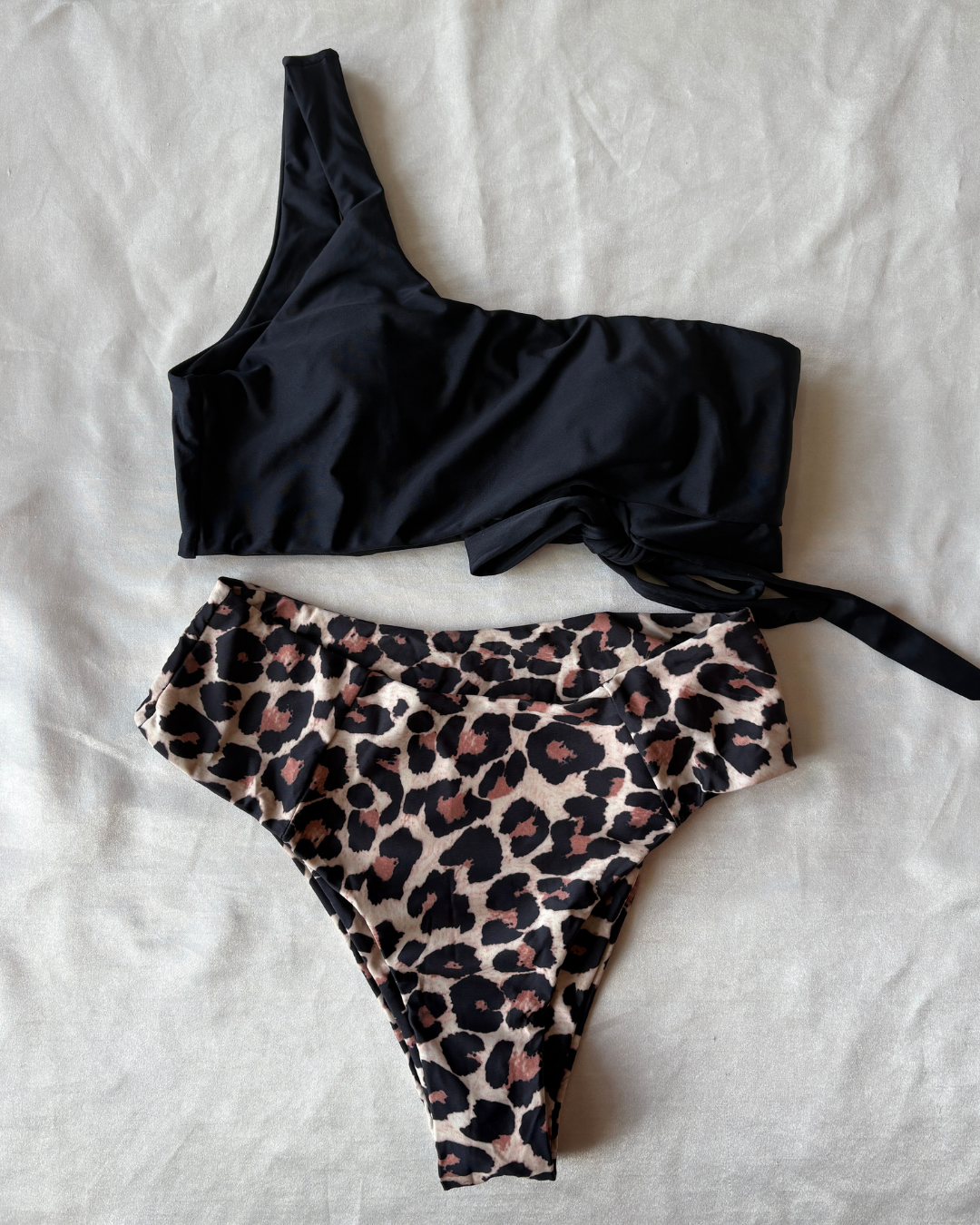 Bikini con tirante de un solo lado, copas y calzón alto con estampado animal print.