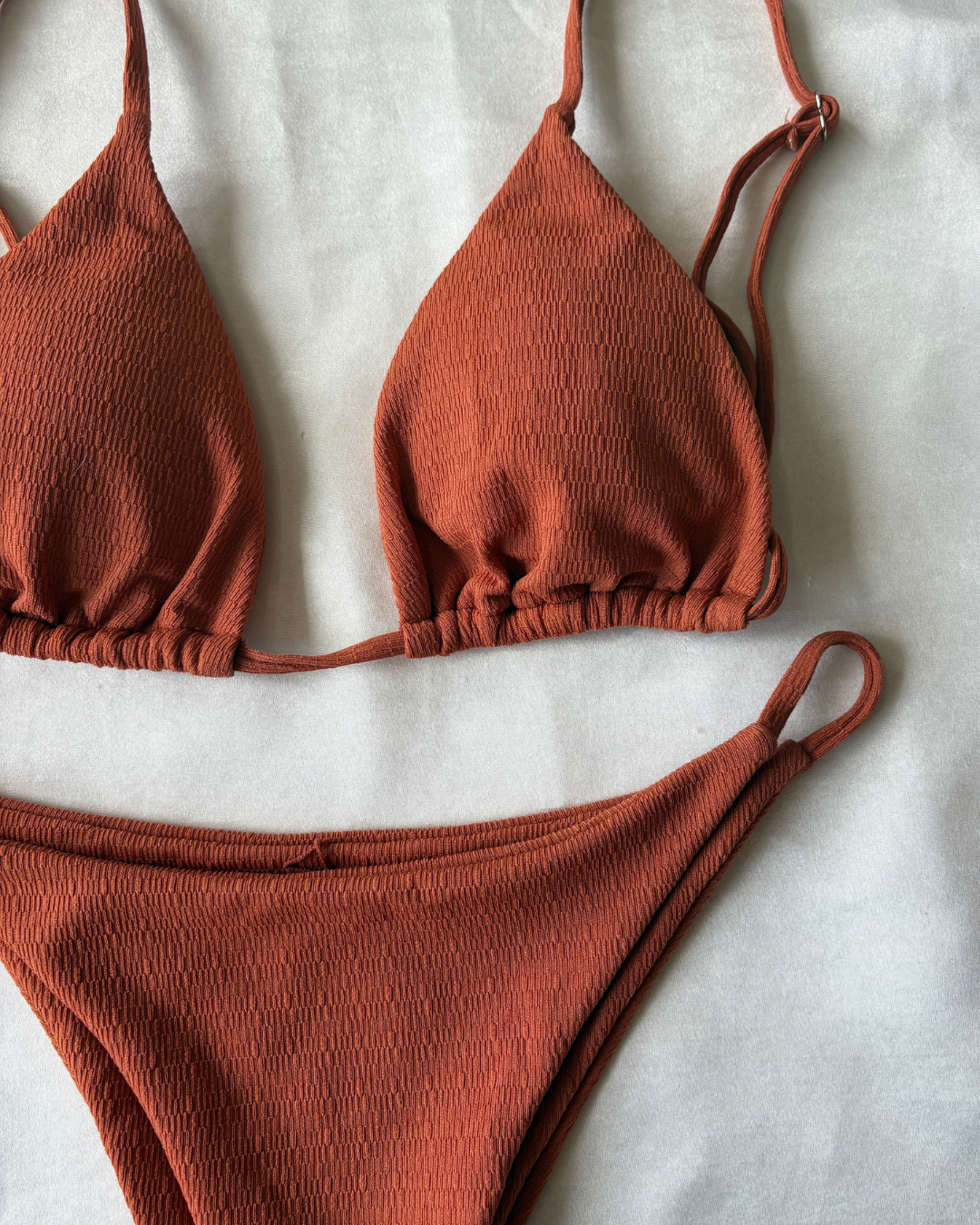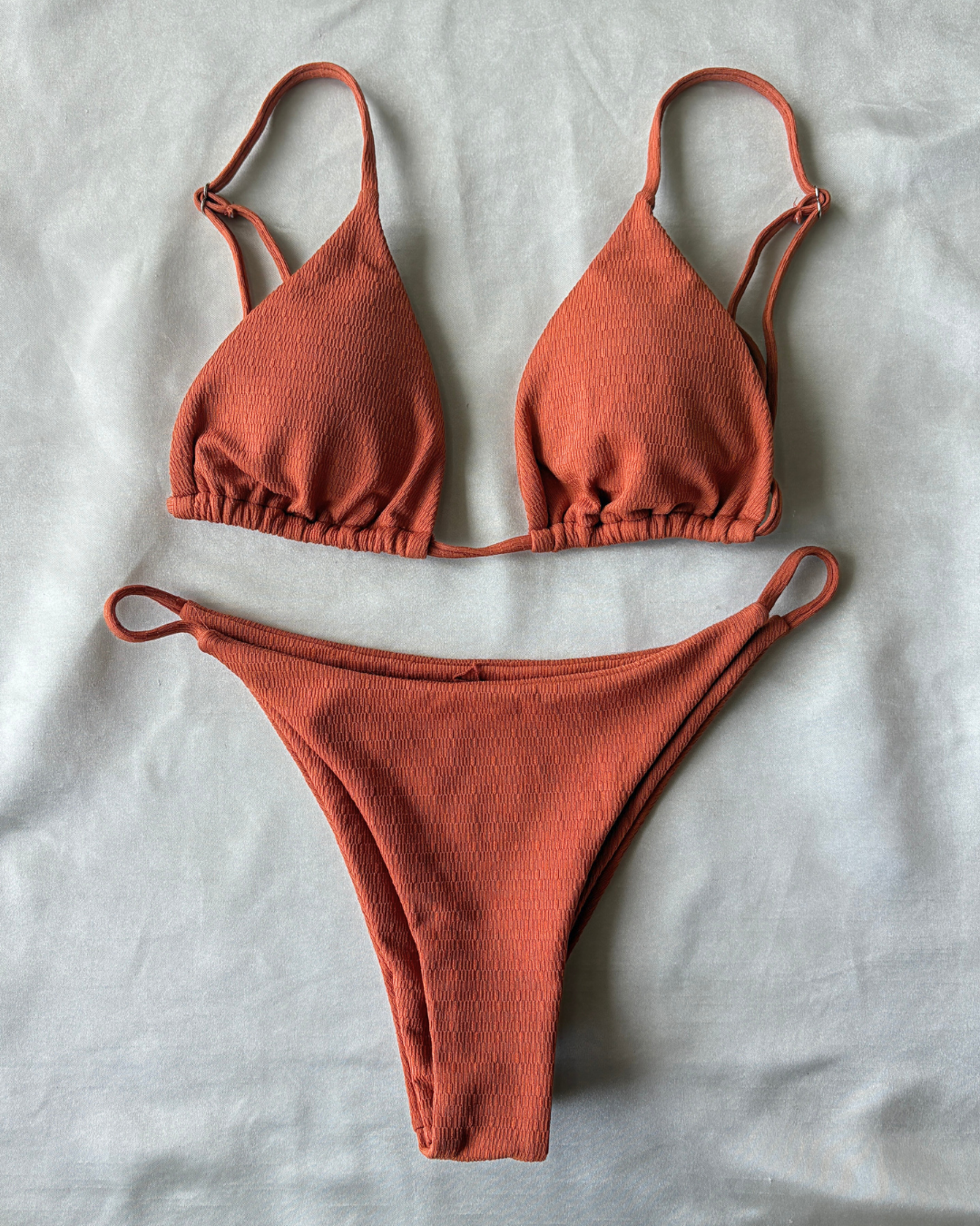 Bikini con tela texturizada, top con copas y calzón de corte pequeño.
