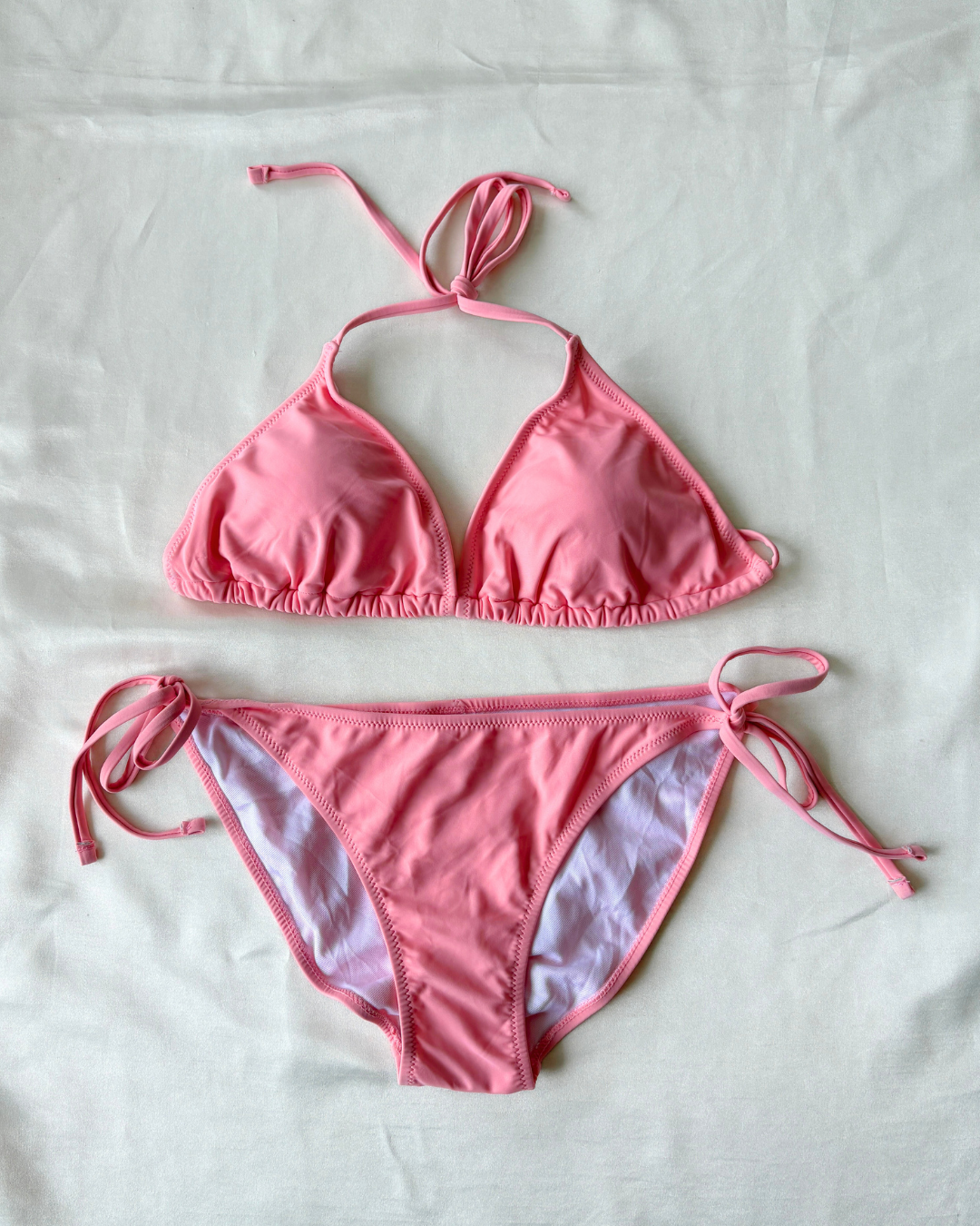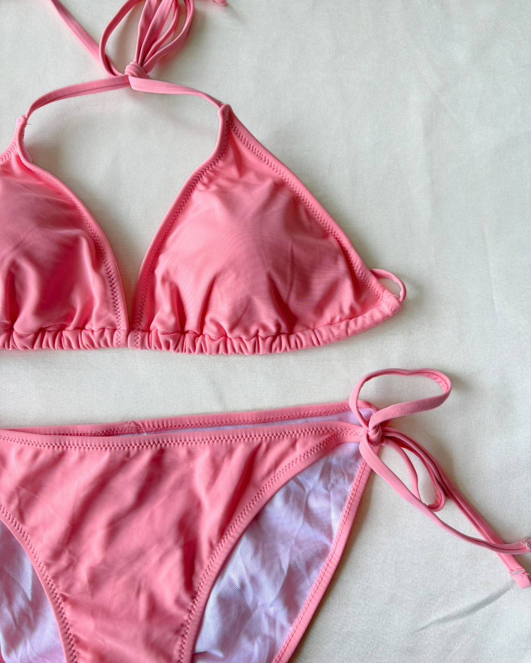 Bikini de triangulo con copas, cuello halter y calzón de corte pequeño, ajustable.