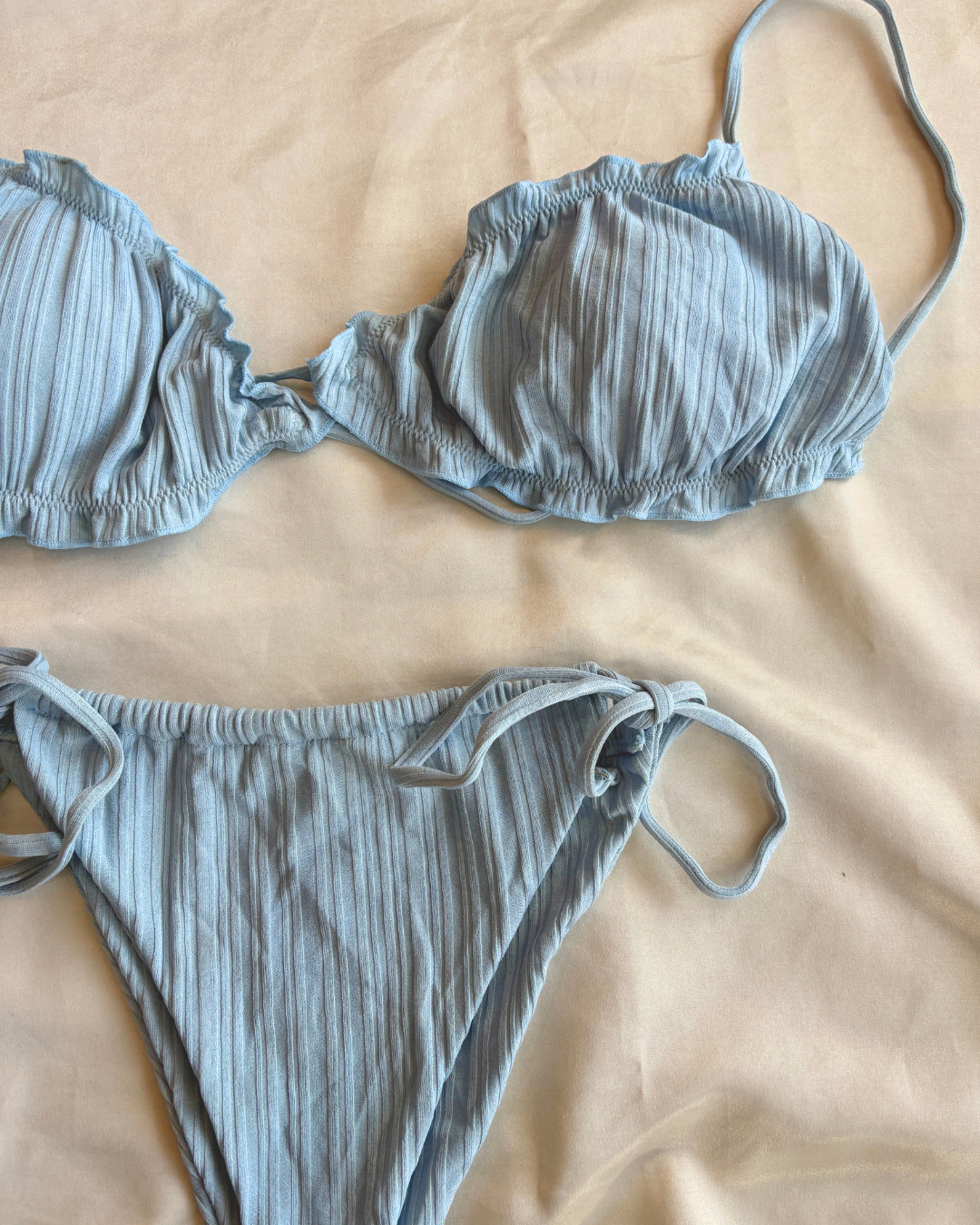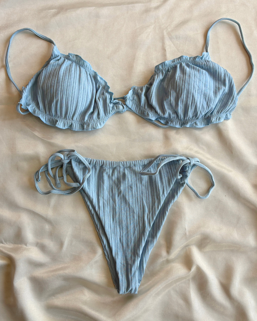 Bikini con copas, calzón ajustable y tela azul texturizada.