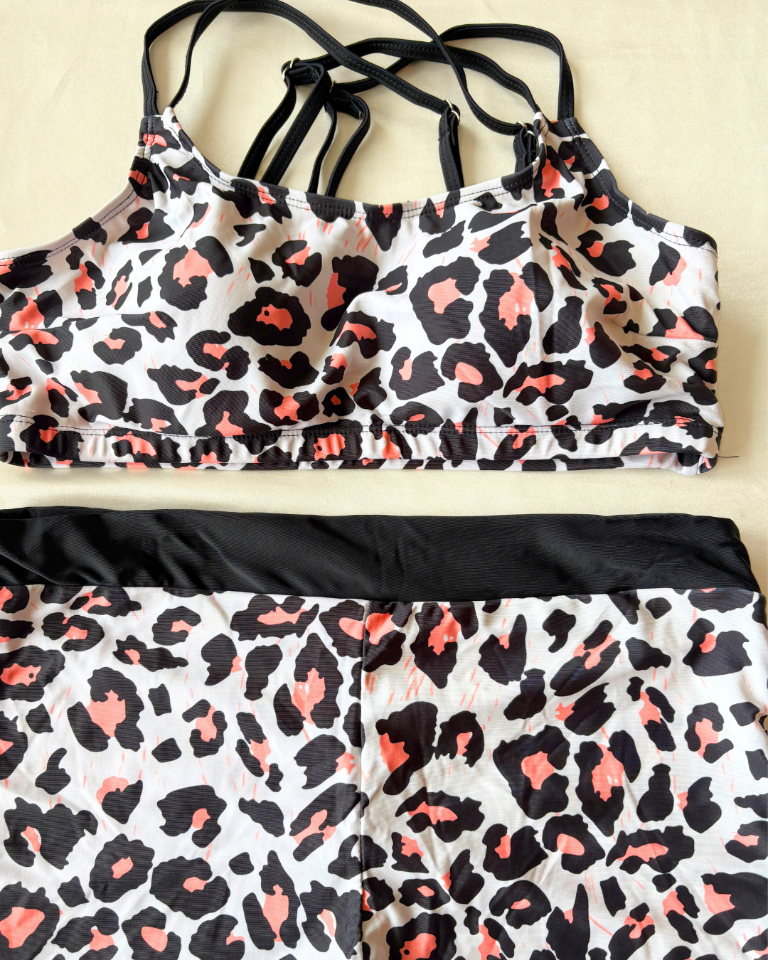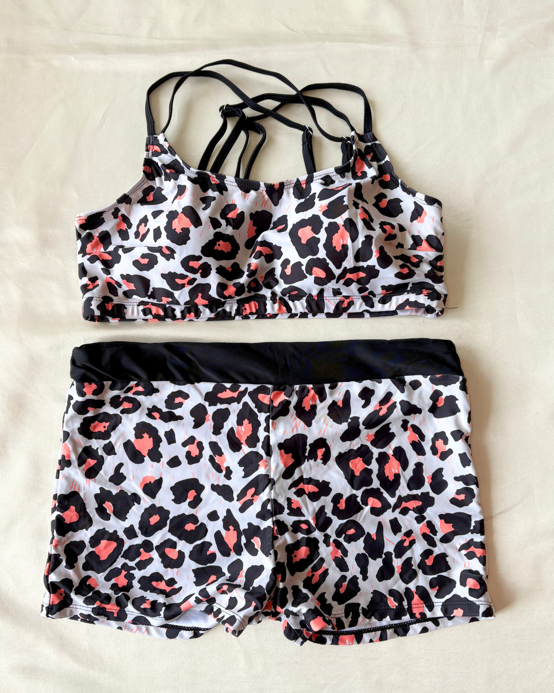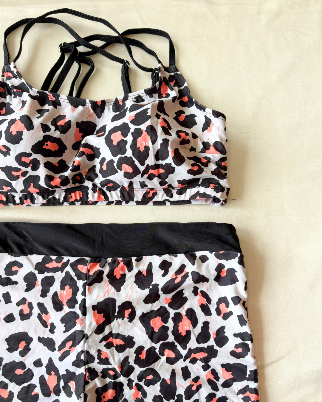 Bikini confeccionado en licra con copas, calzón tipo short y estampado animal print.