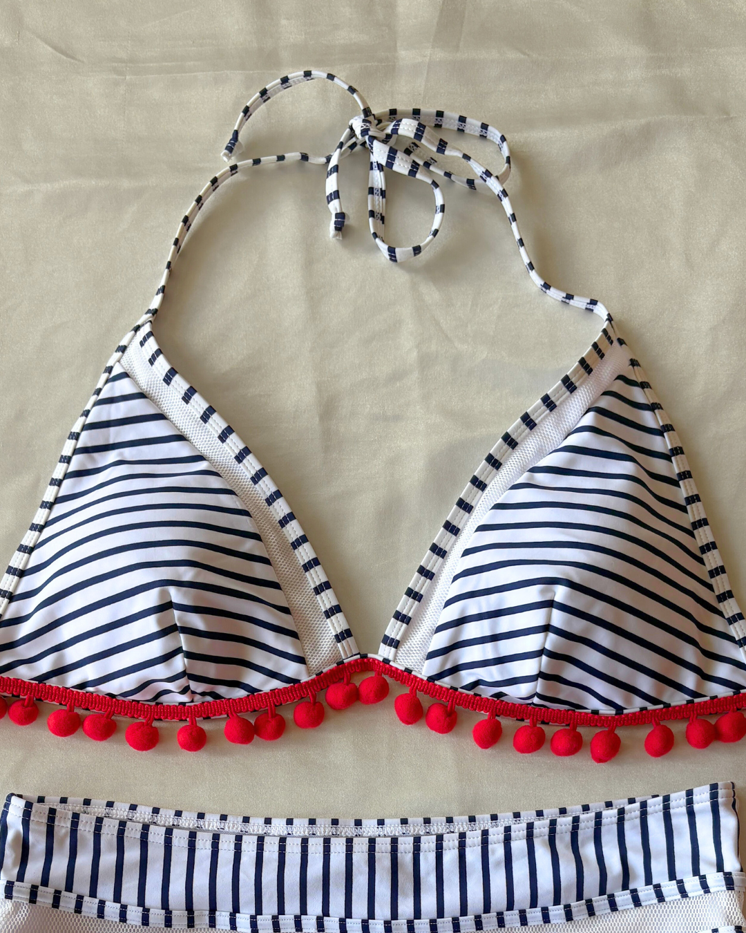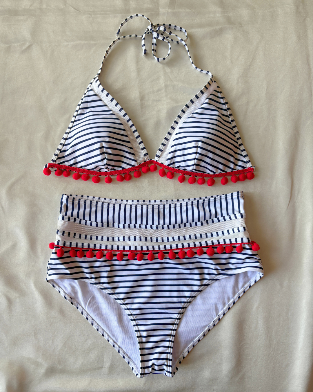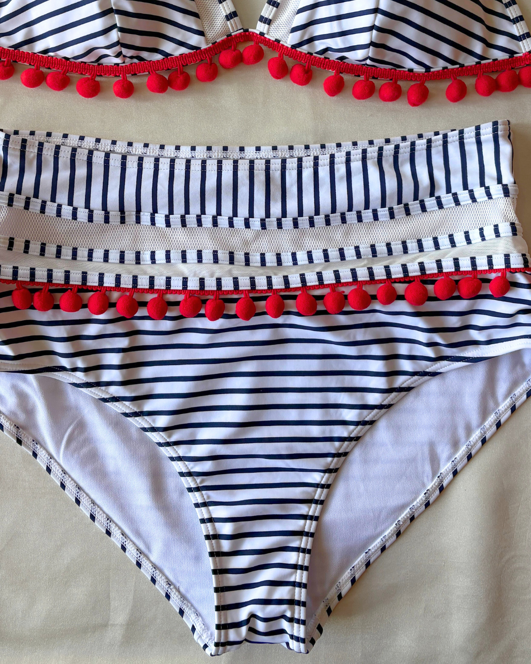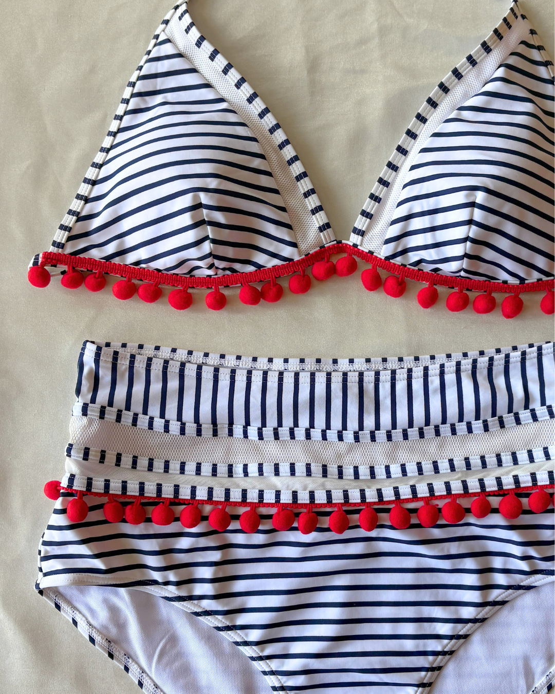 Bikini con copas, cuello halter y calzón de corte alto , con un diseño de rayas y pompones.