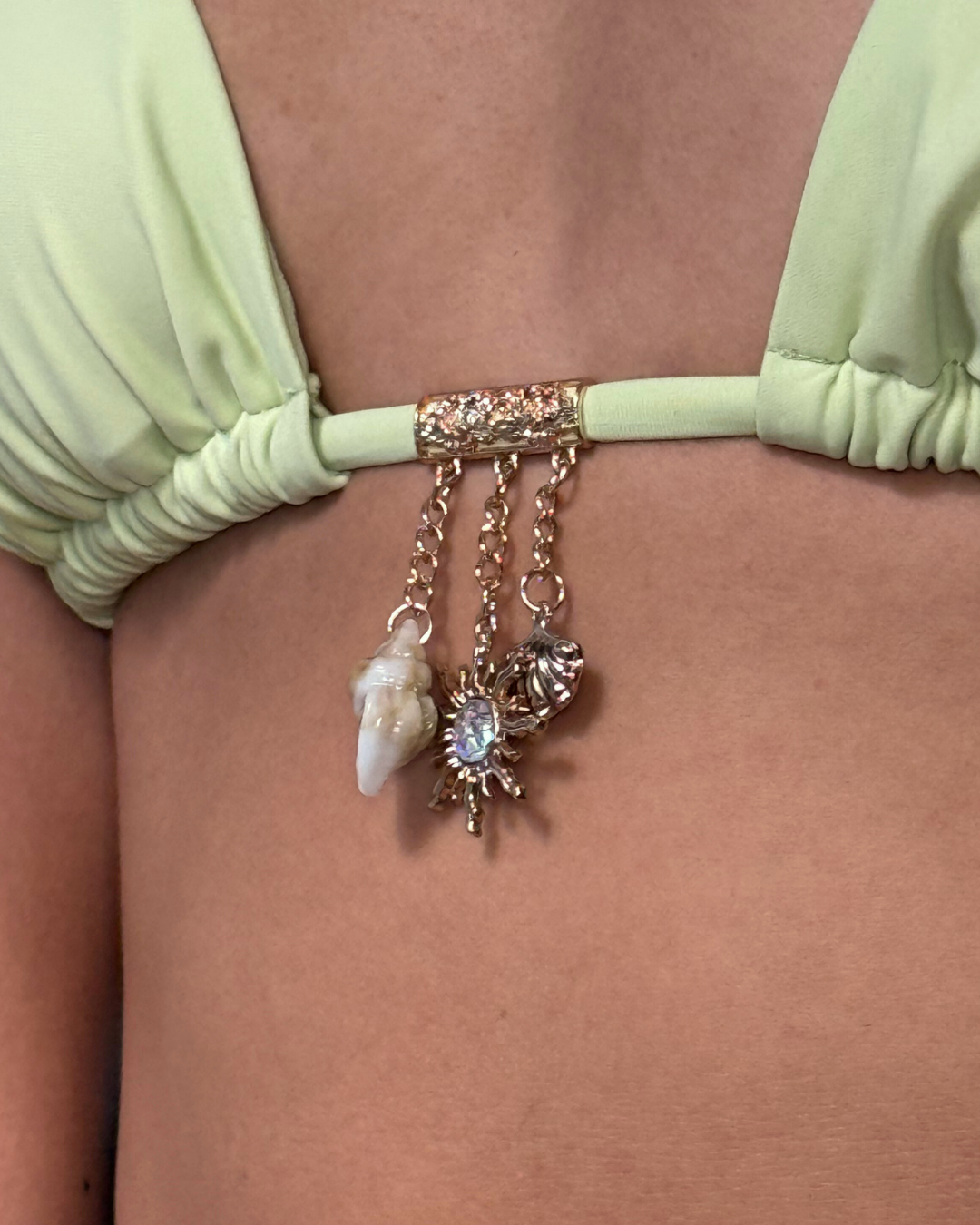 Detalle colgante en el centro del pecho, que consiste en pequeñas cadenas doradas con dijes de conchas marinas y elementos náuticos.