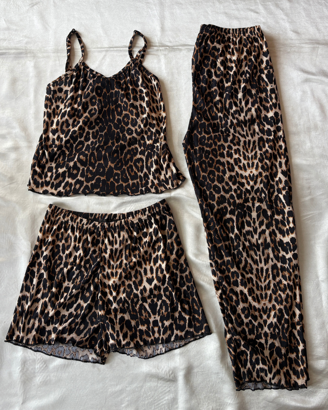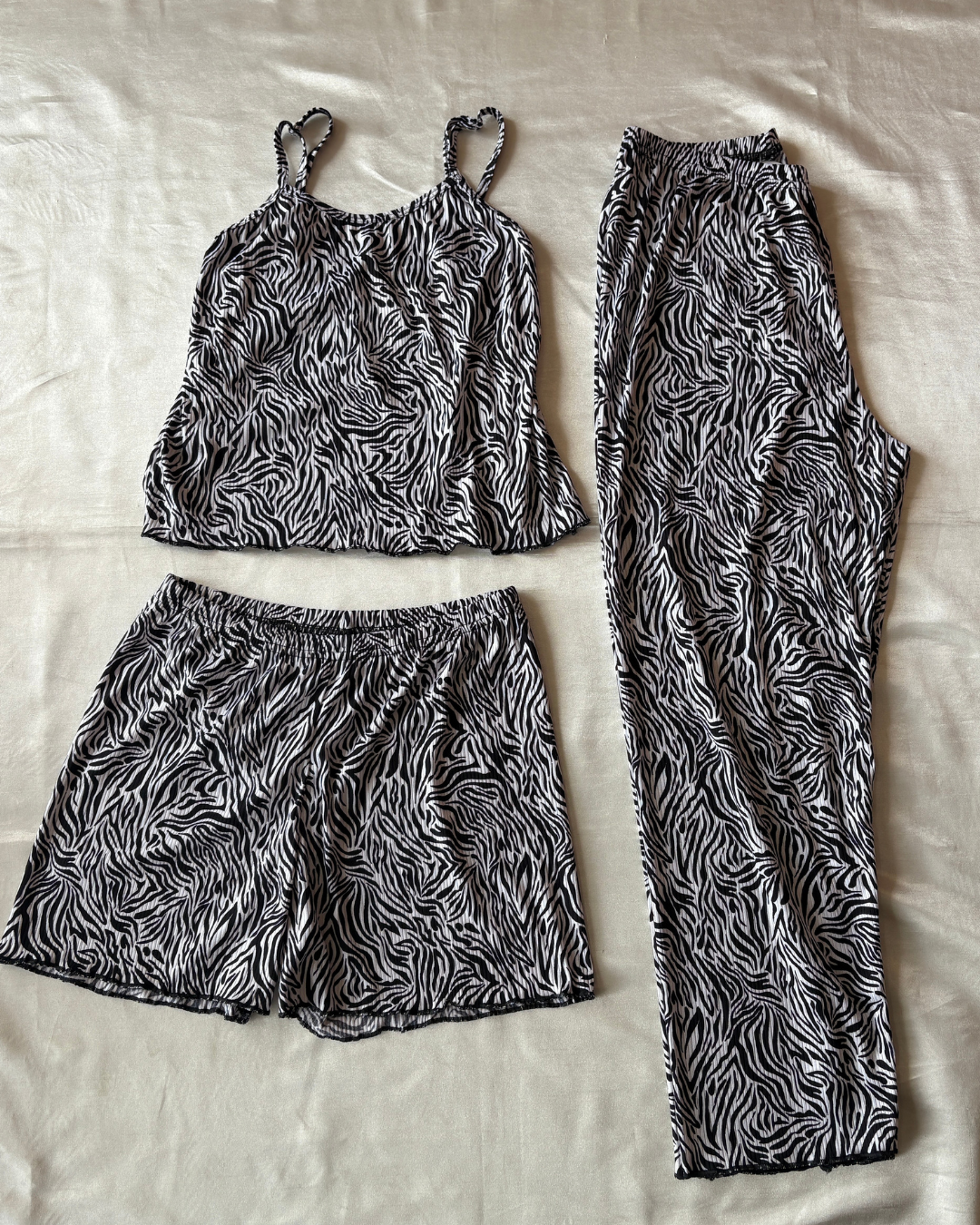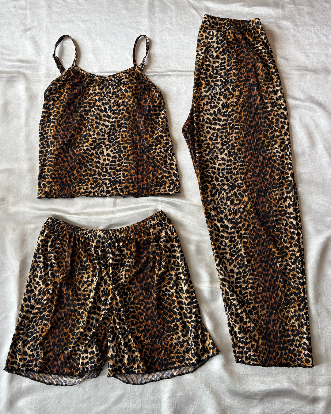 Set de 3 piezas: pantalón, top y short con un diseño animal print.