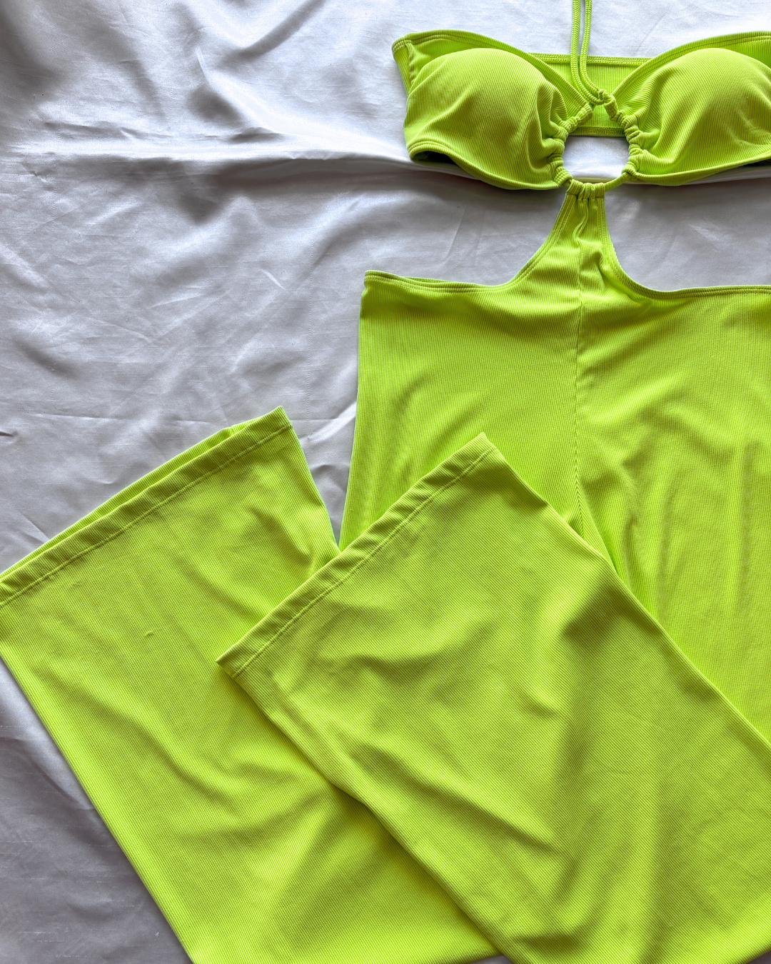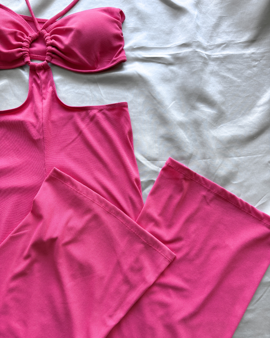 Palazzo de colores llamativos, con cuello halter y aberturas en la parte central y los laterales, que le dan un toque juvenil.
