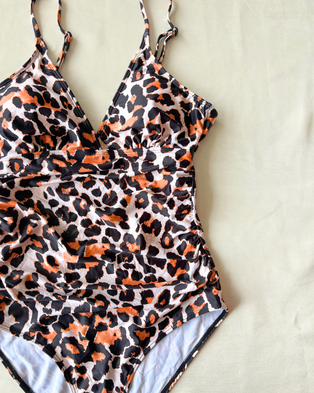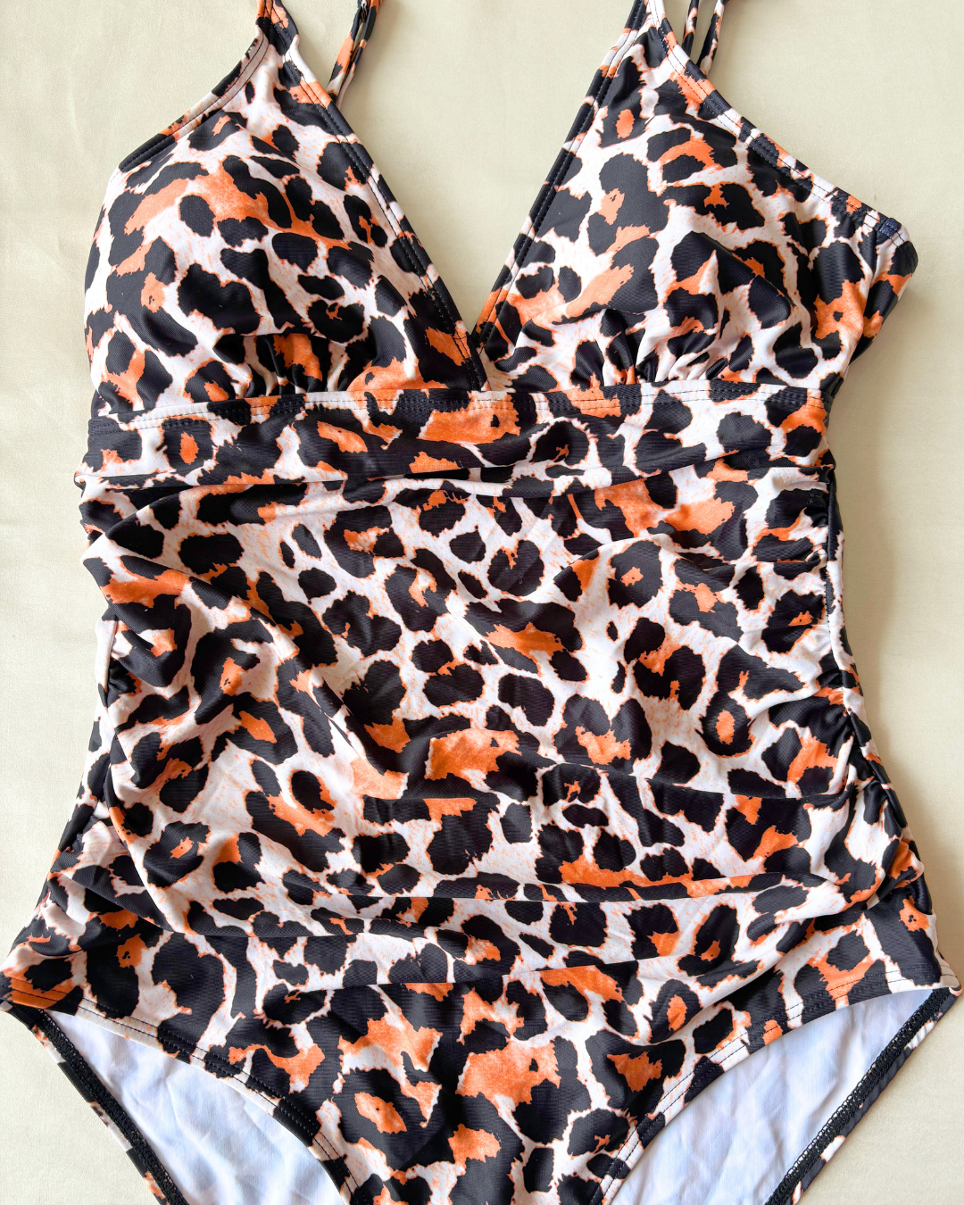 Traje completo confeccionado en licra, con calzón de pierna alta y estampado animal print.