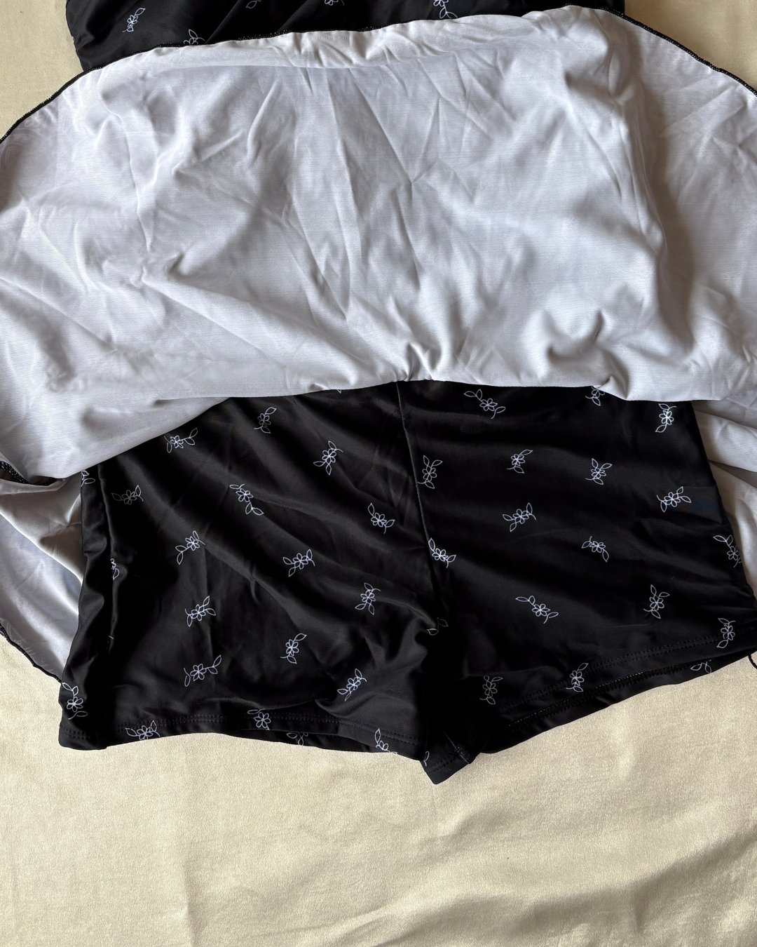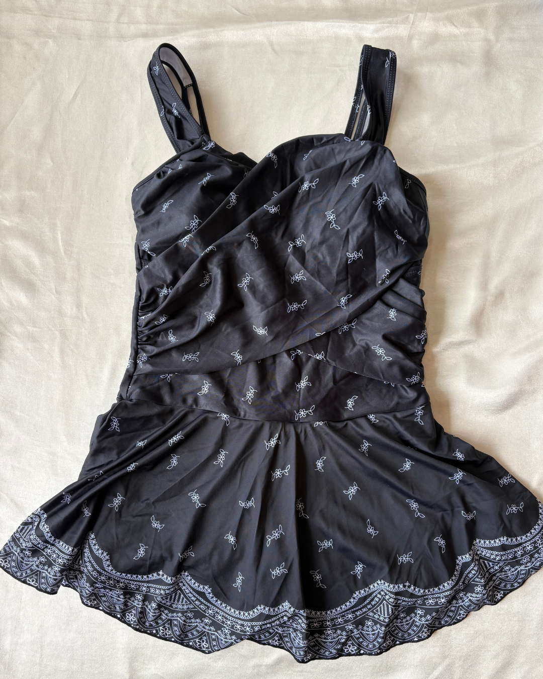 Traje completo con copas , falda-short y con un estampado único.