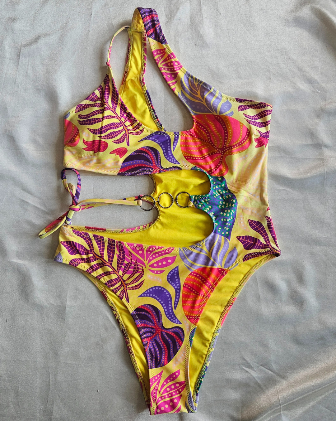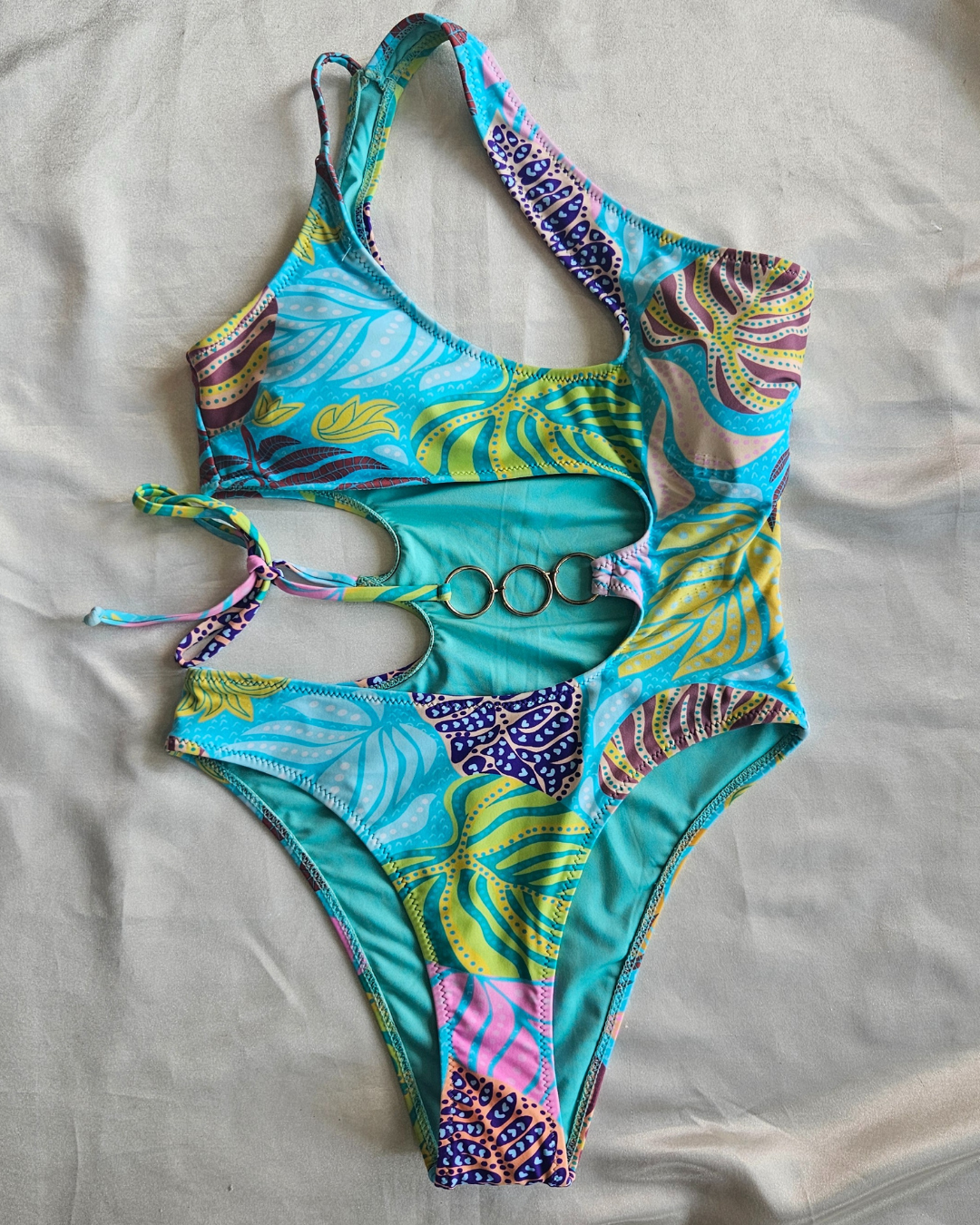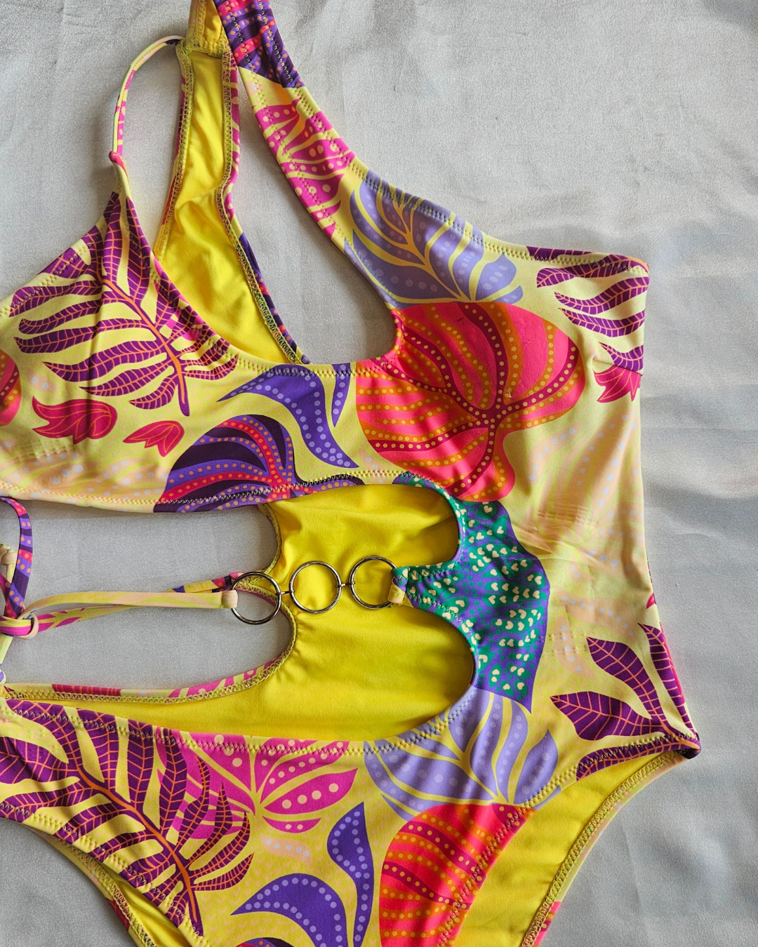 Traje completo con estampado de hojas en diferentes colores, decorado con una cadena con tres aros en la parte delantera.