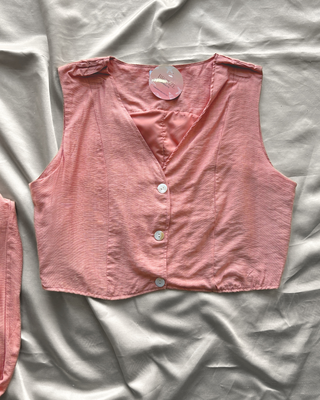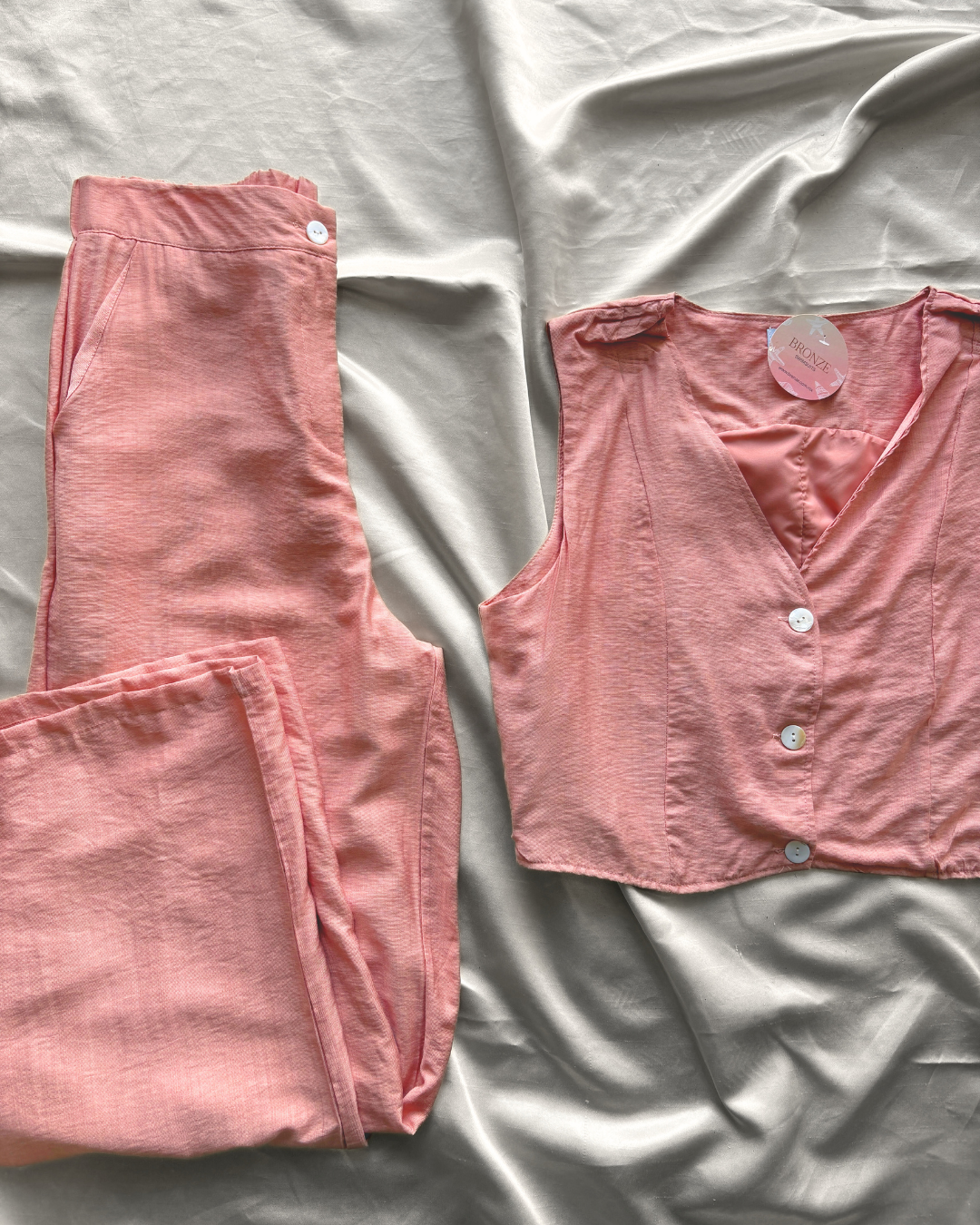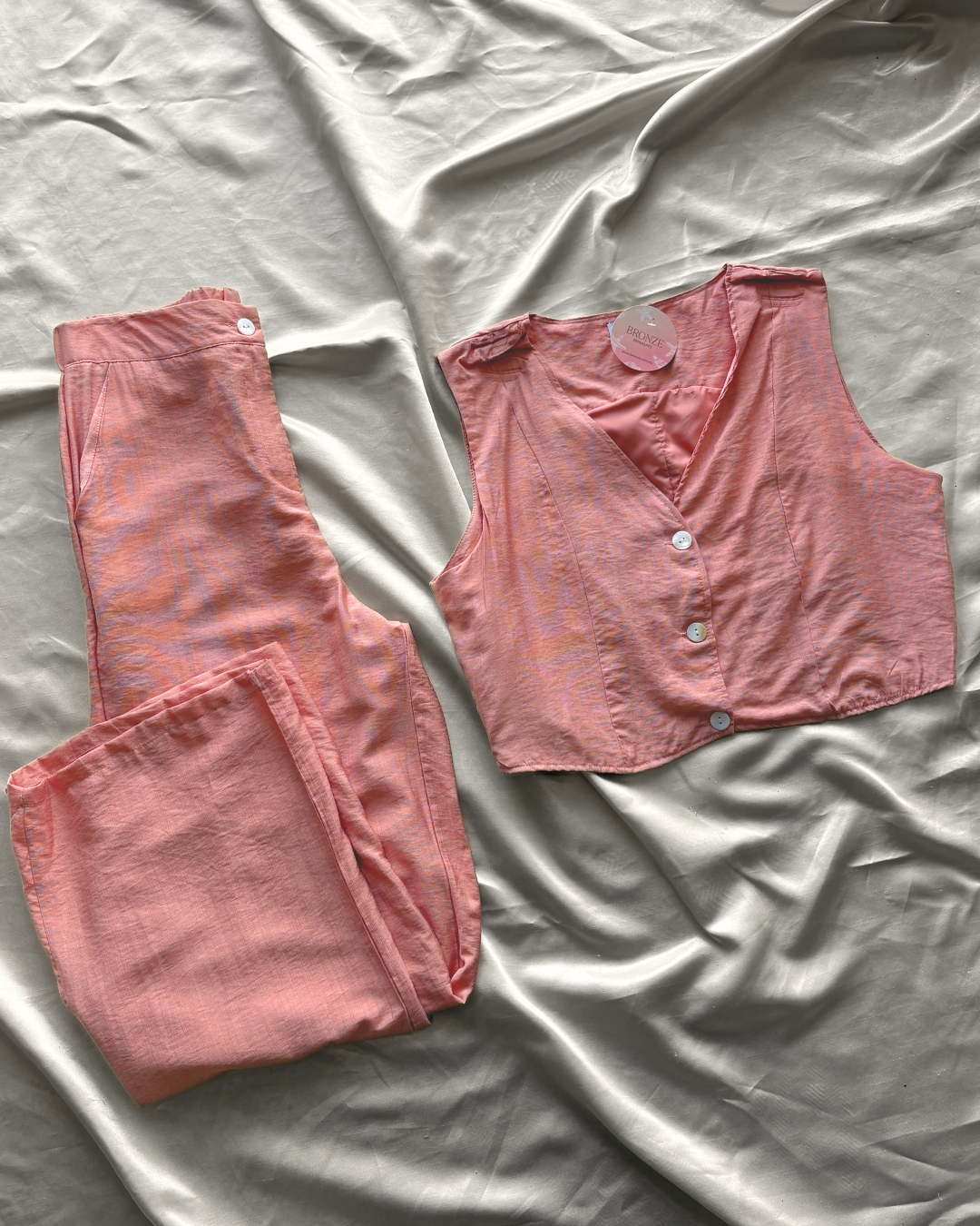 Conjunto coral en lino, pantalón amplio y top tipo chaleco con delicados botones frontales.