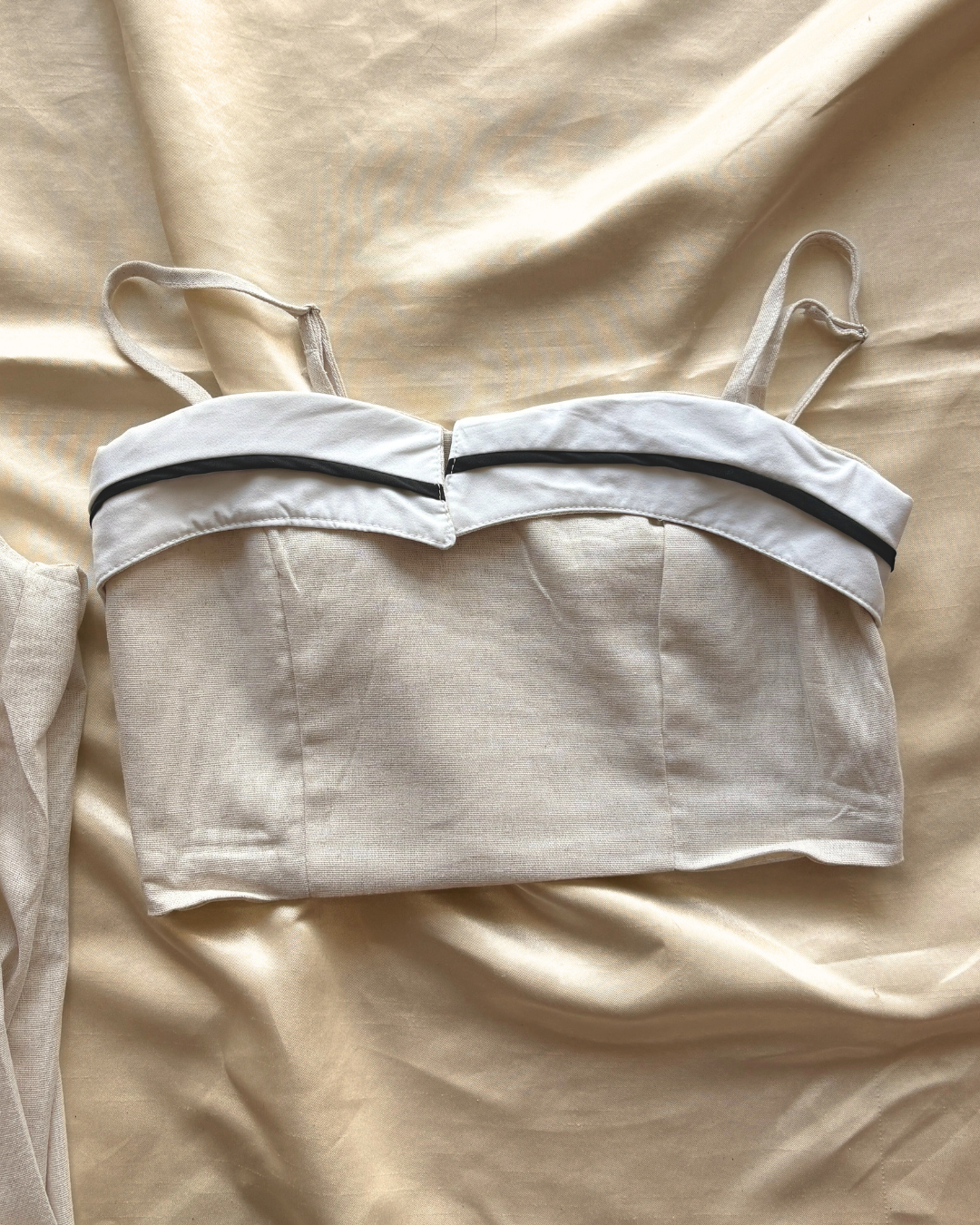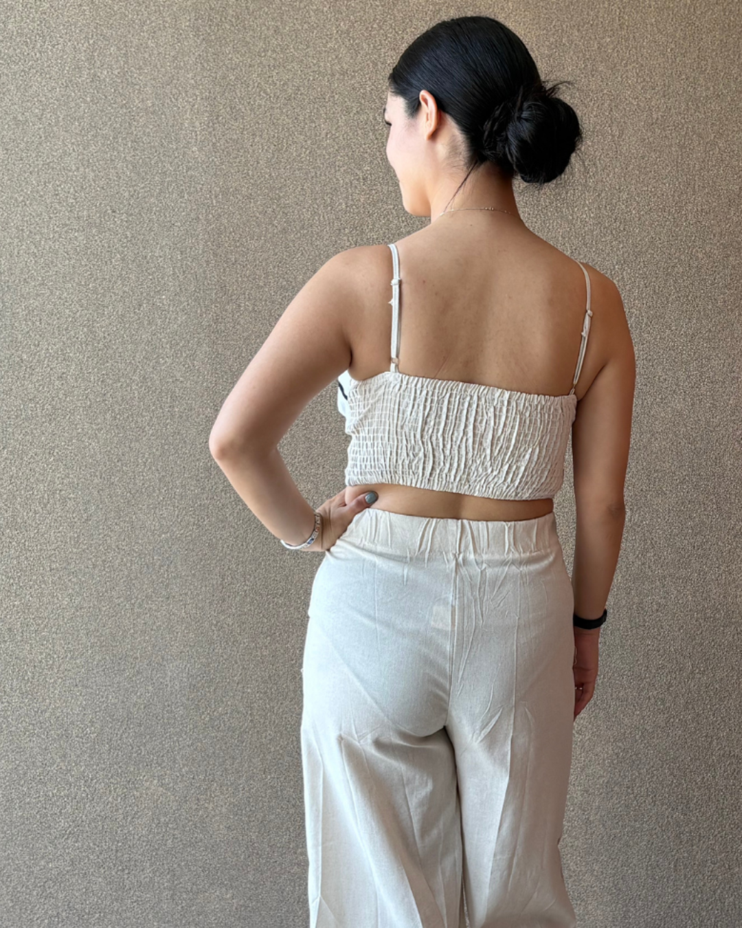 Conjunto beige en lino, top con franjas blanco y negro, y pantalón holgado, fresco y único.