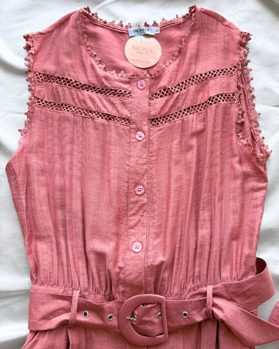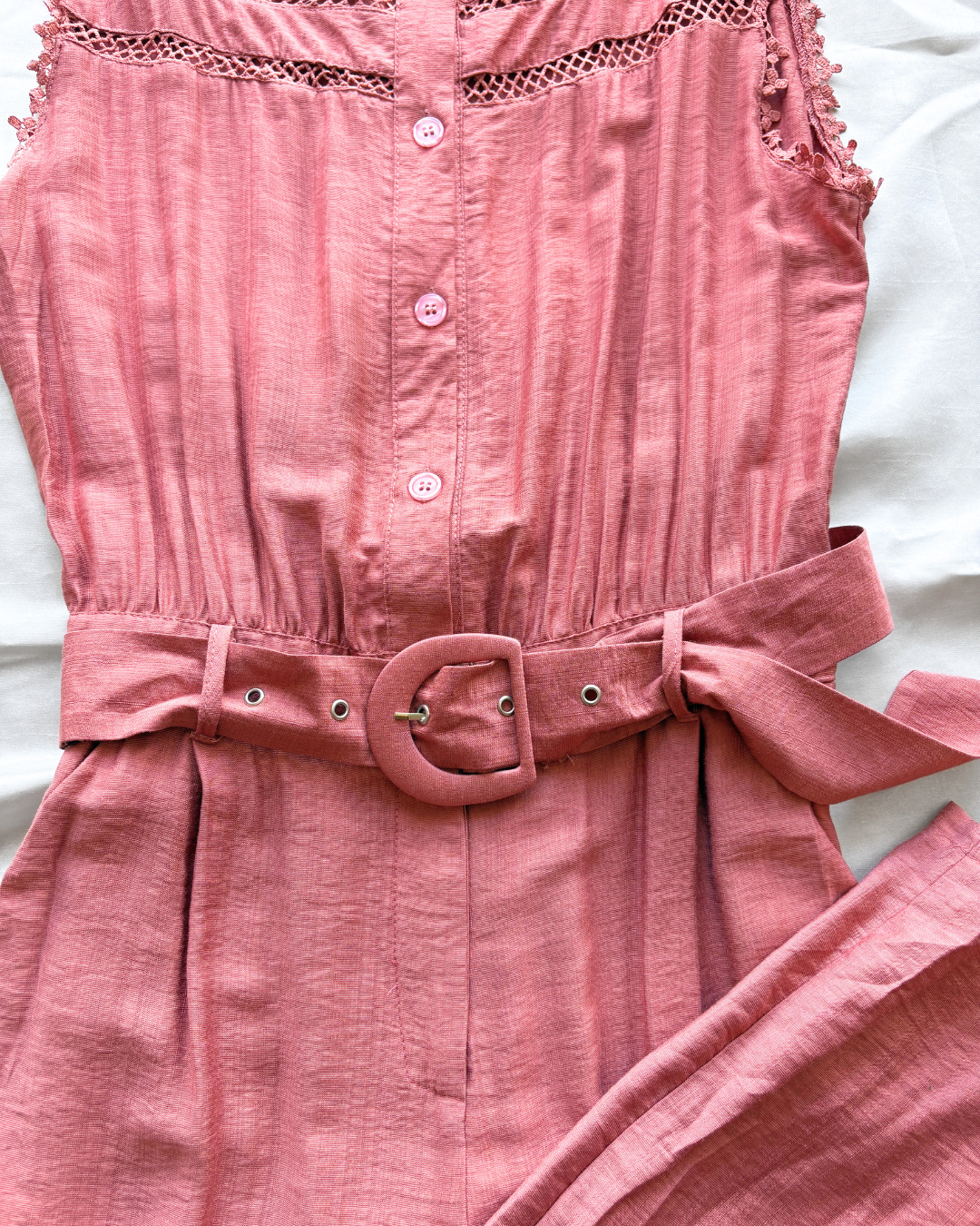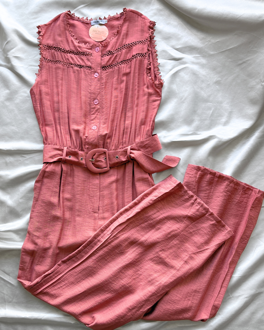 Palazzo blanco y coral de lino, con encaje en mangas, cinturón ajustable y bolsillos funcionales.