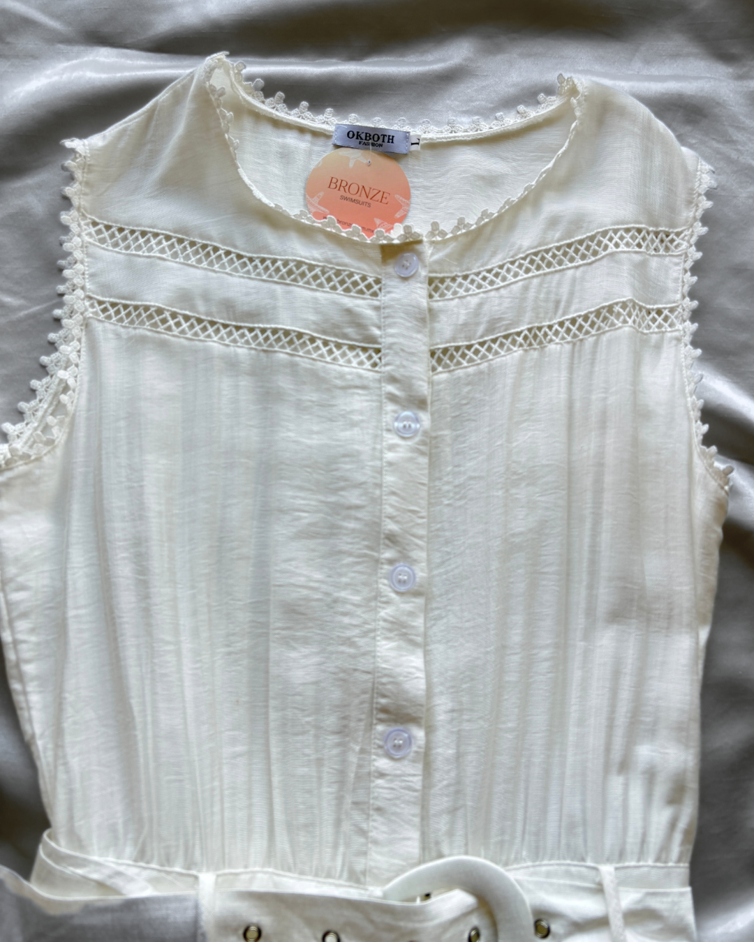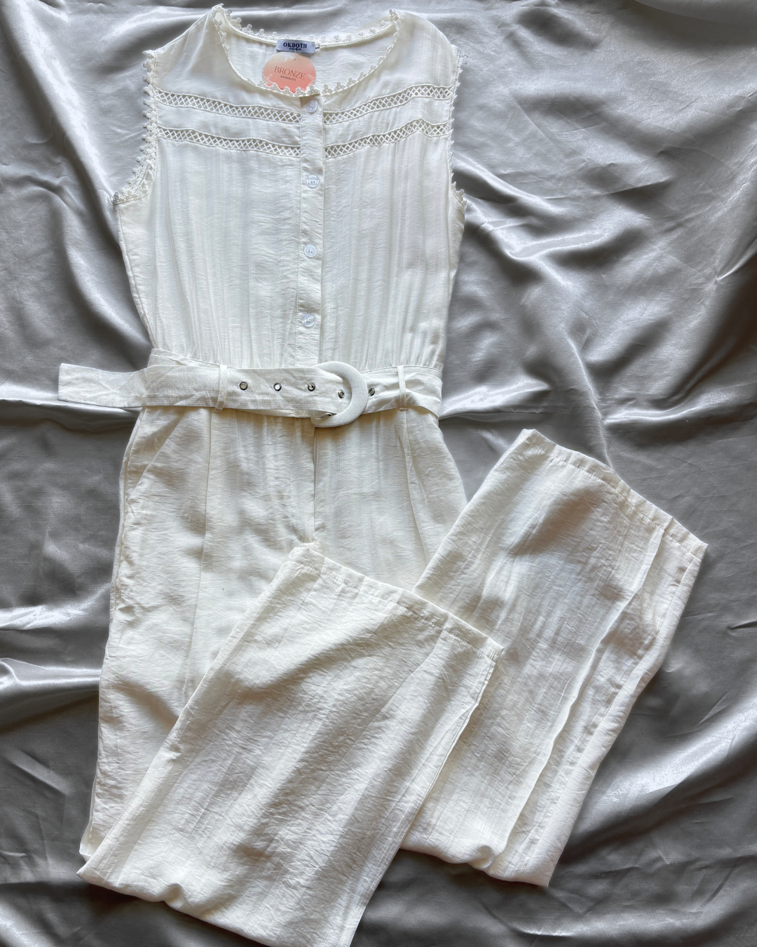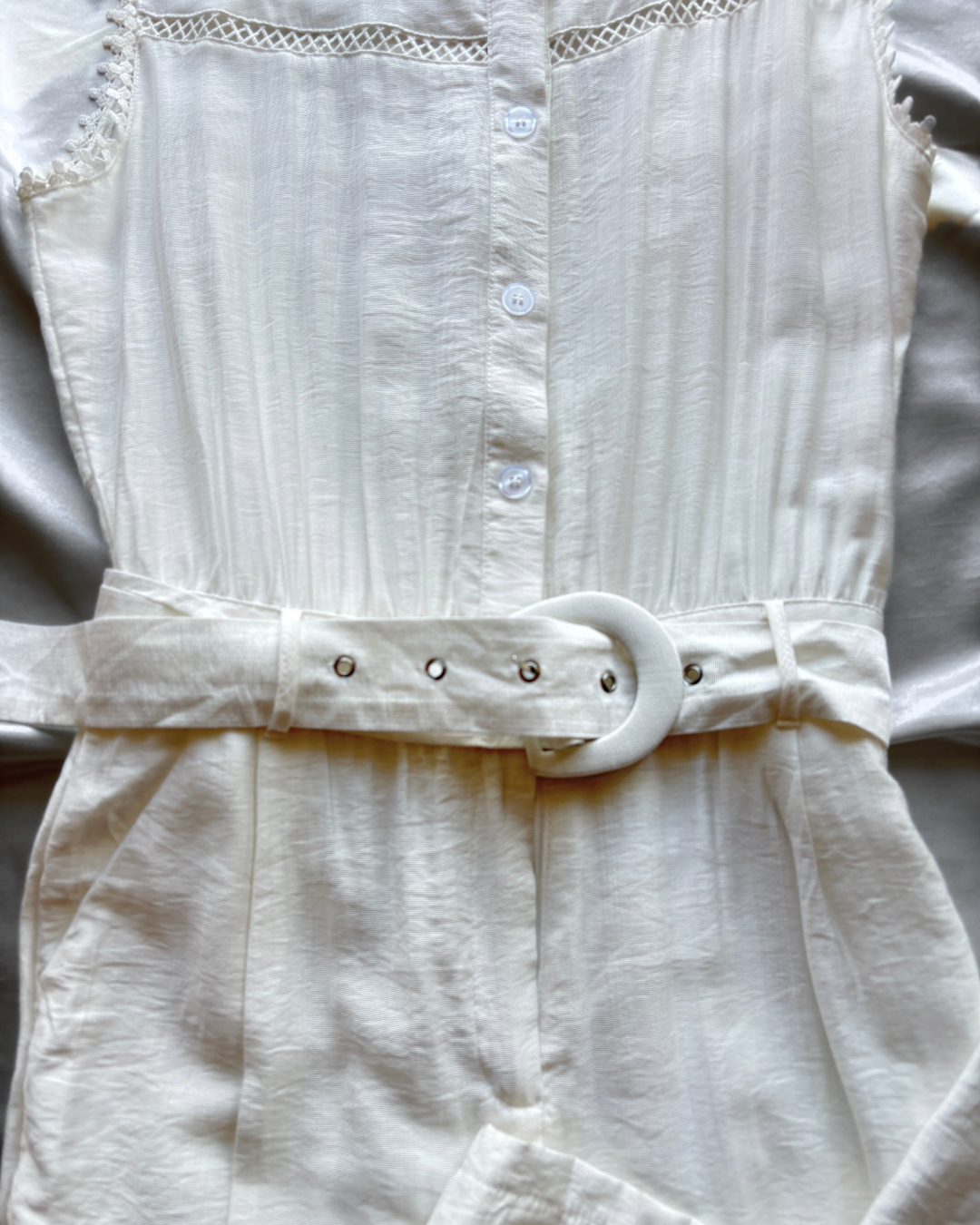 Palazzo blanco y coral de lino, con encaje en mangas, cinturón ajustable y bolsillos funcionales.