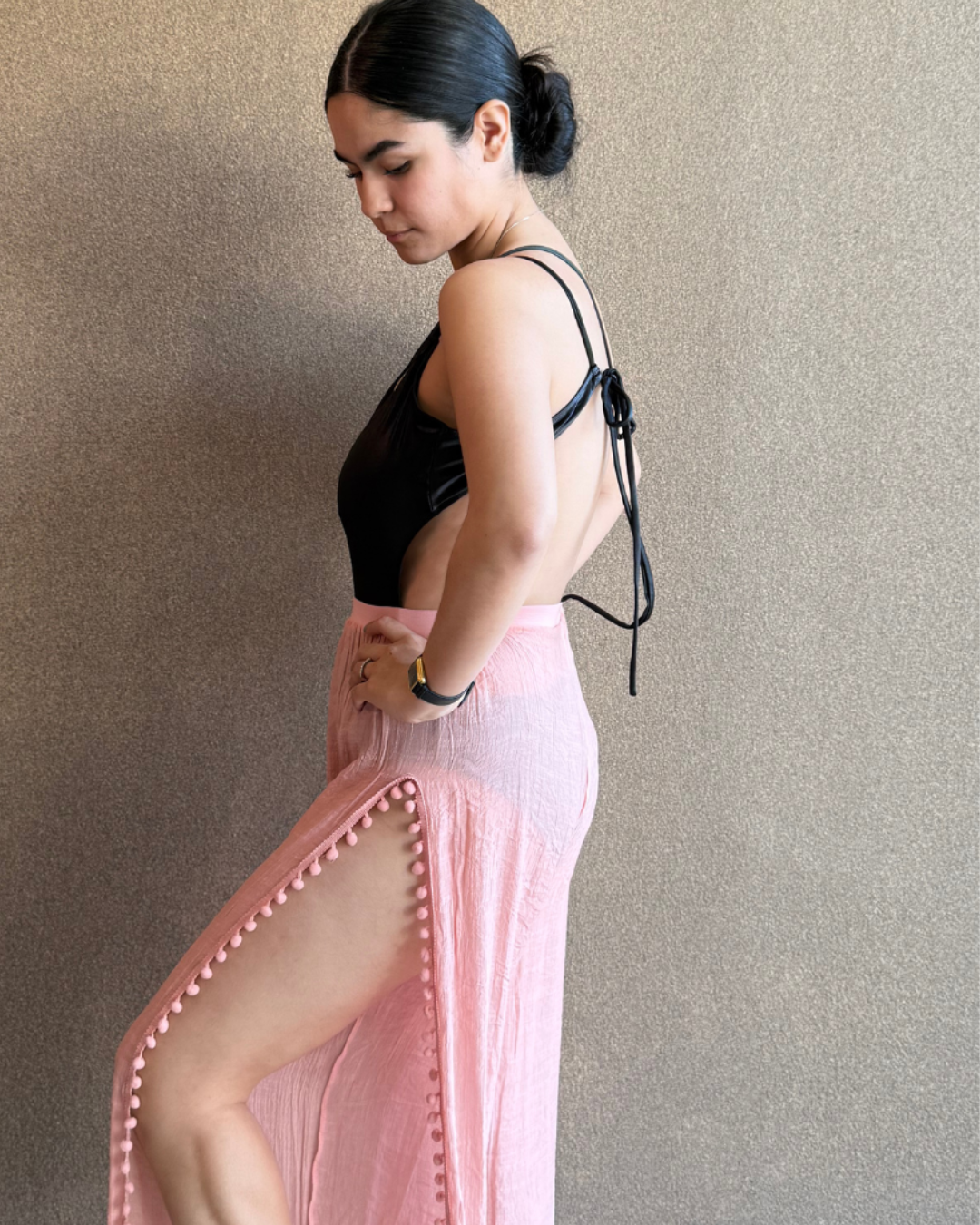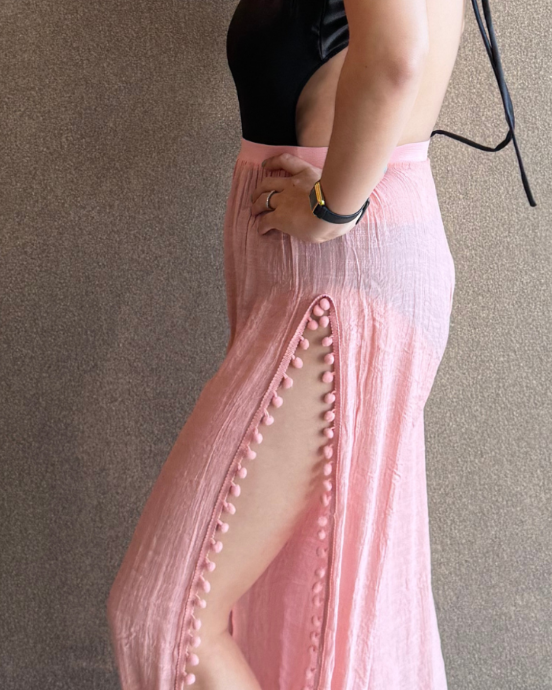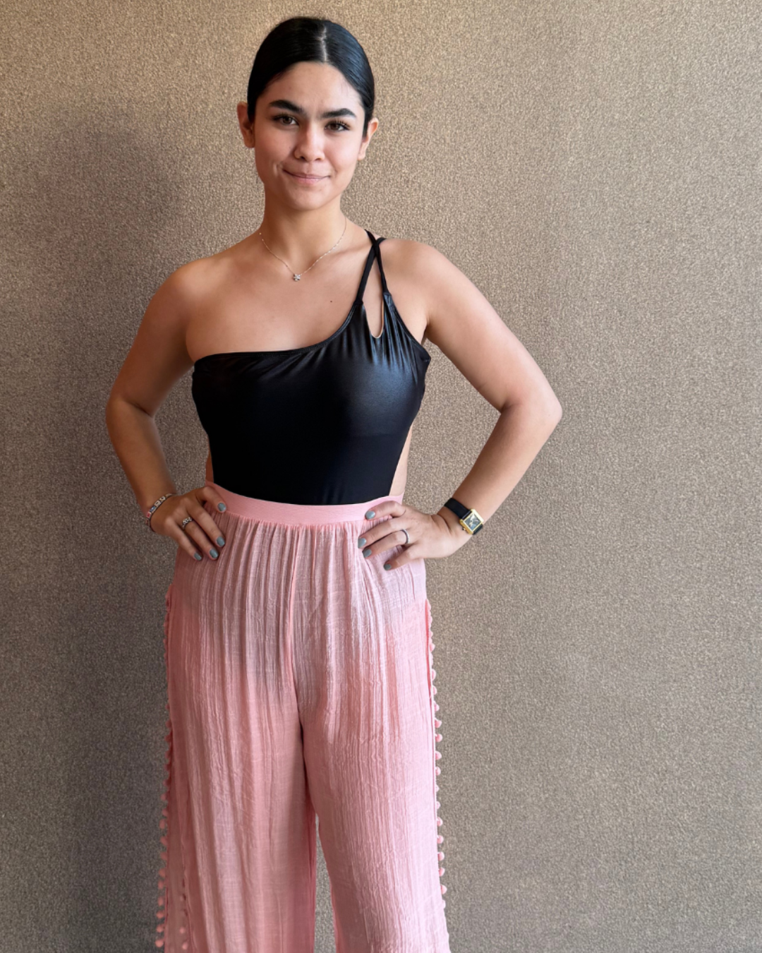Pantalón liso con aberturas laterales para mayor frescura y pompones en los costados que aportan un estilo juvenil.Talla: Unitalla