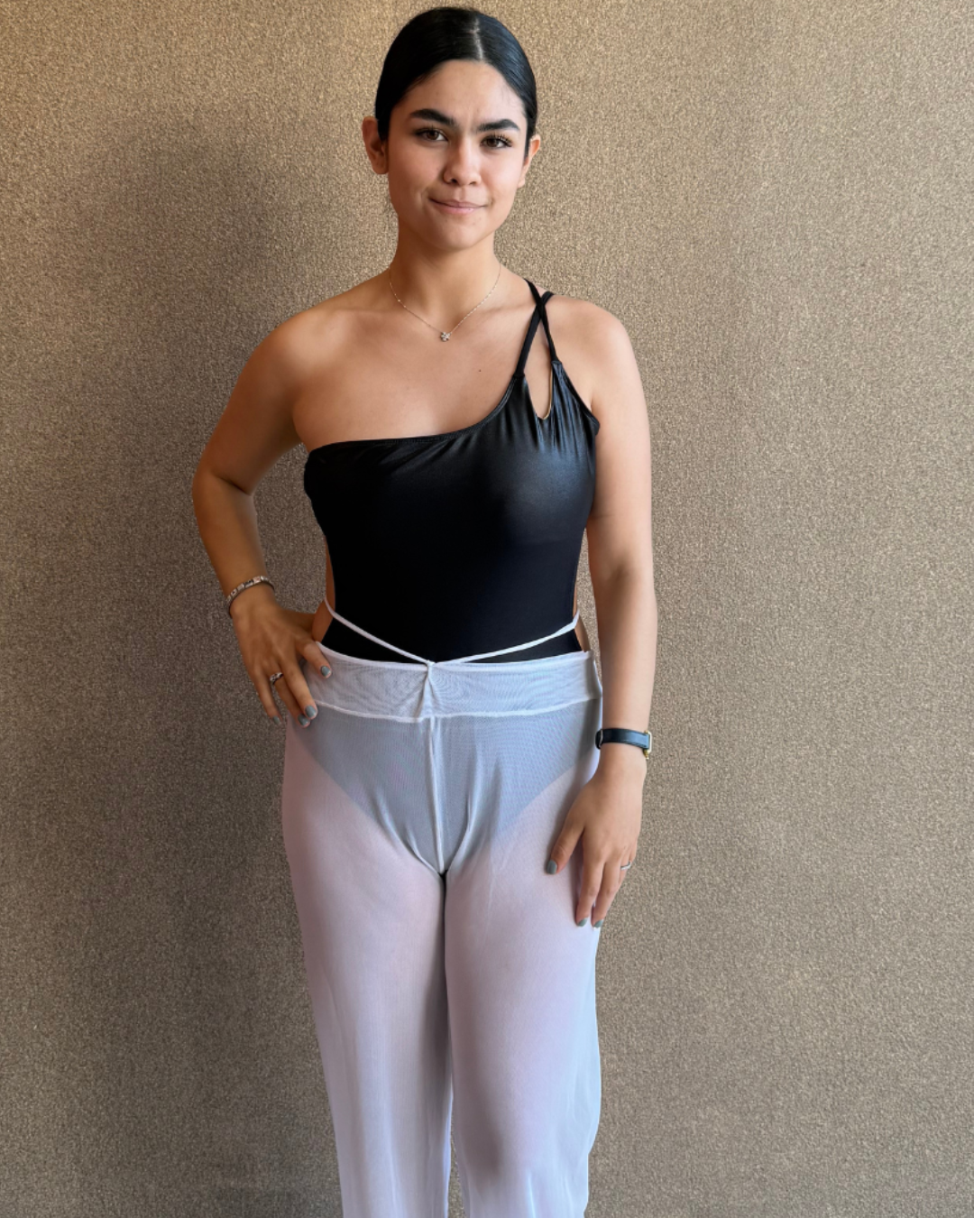 Pantalón liso y cómodo, con tela transparente y ajuste en la parte superior.