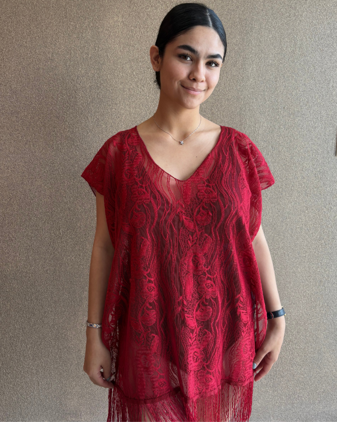 Salida tipo poncho con encaje y flecos en la parte inferior
