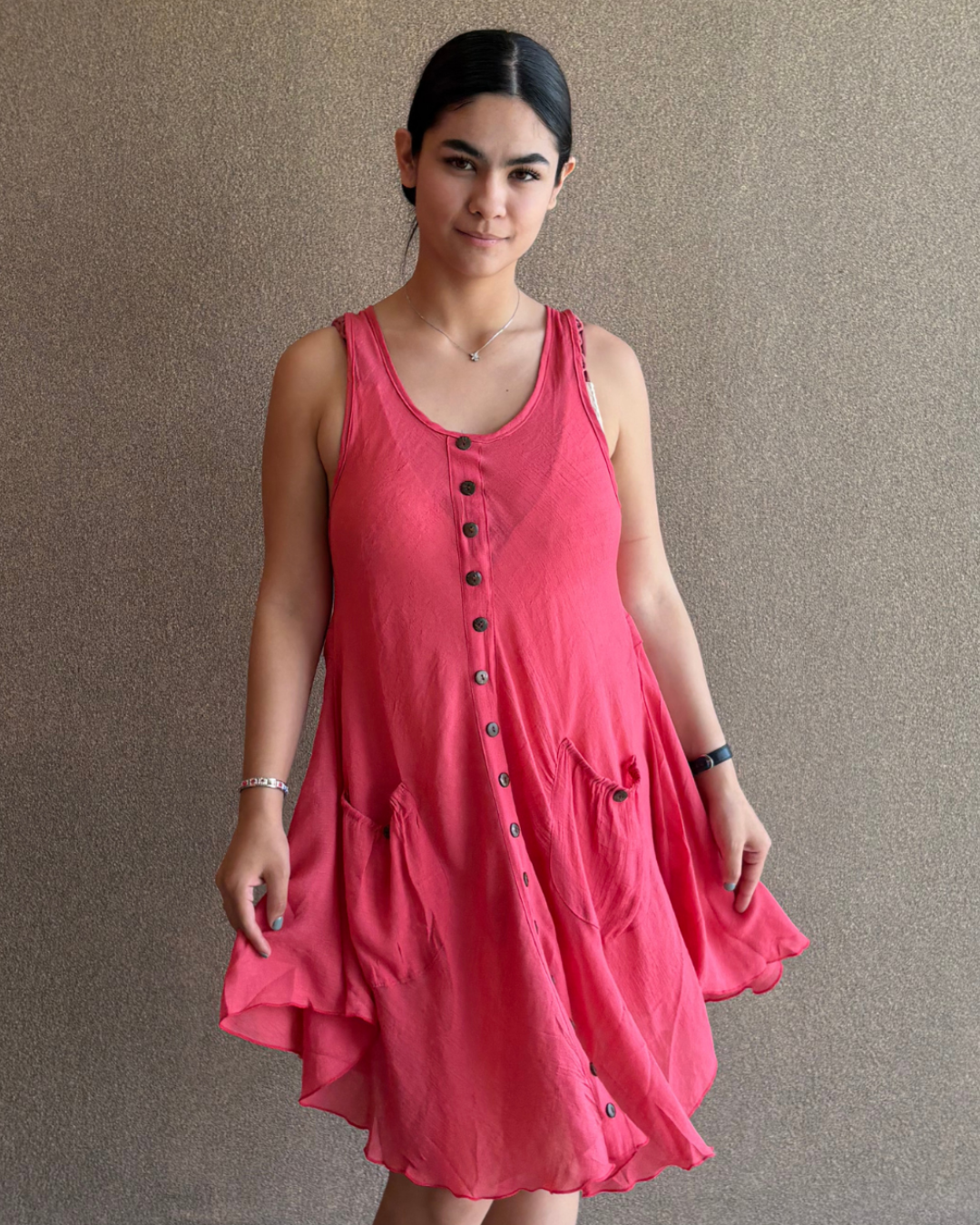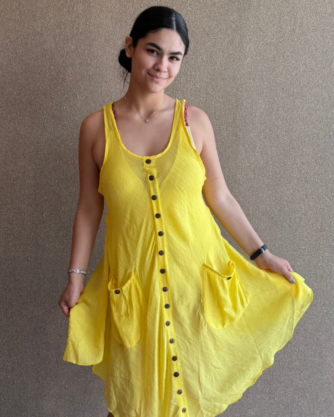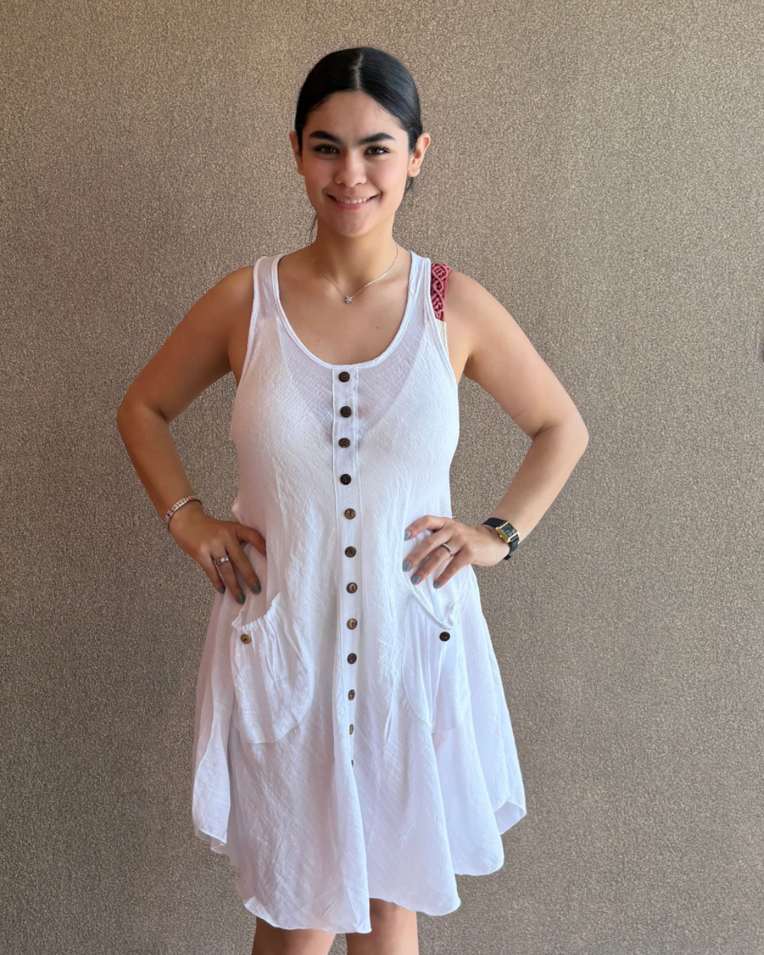 Vestidos cortos de lino en tonos primaverales, con botones café y bolsillos laterales funcionales.