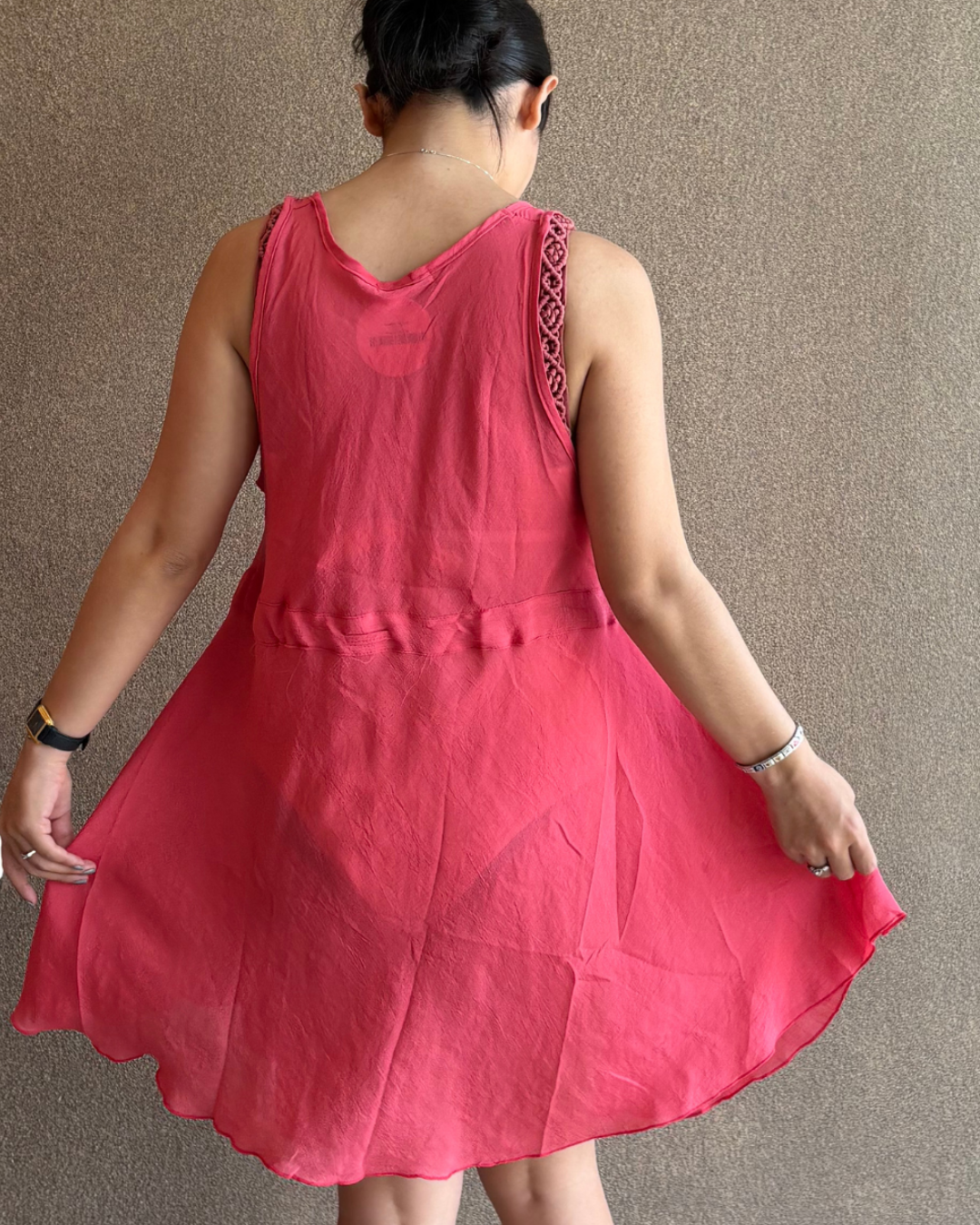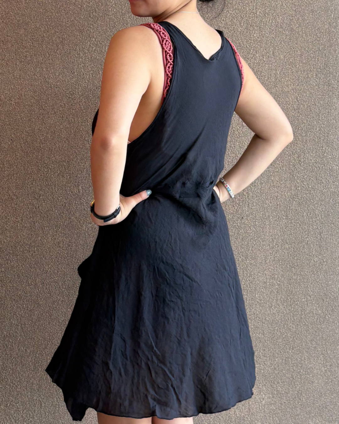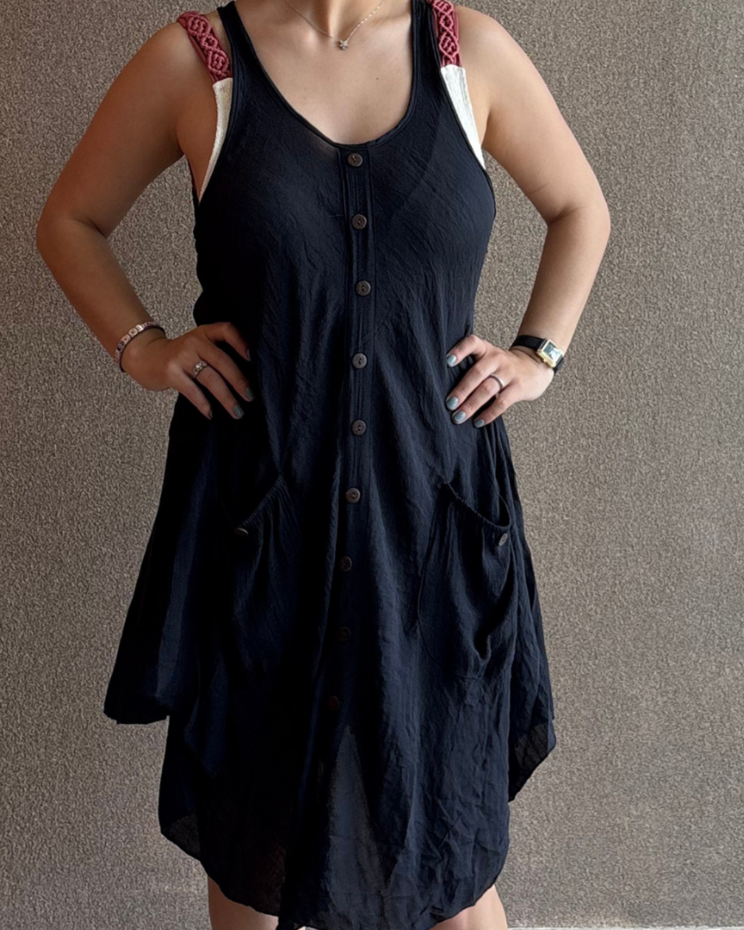 Vestidos cortos de lino en tonos primaverales, con botones café y bolsillos laterales funcionales.