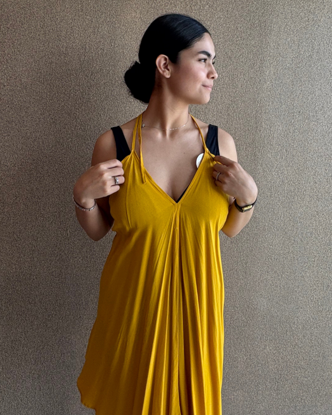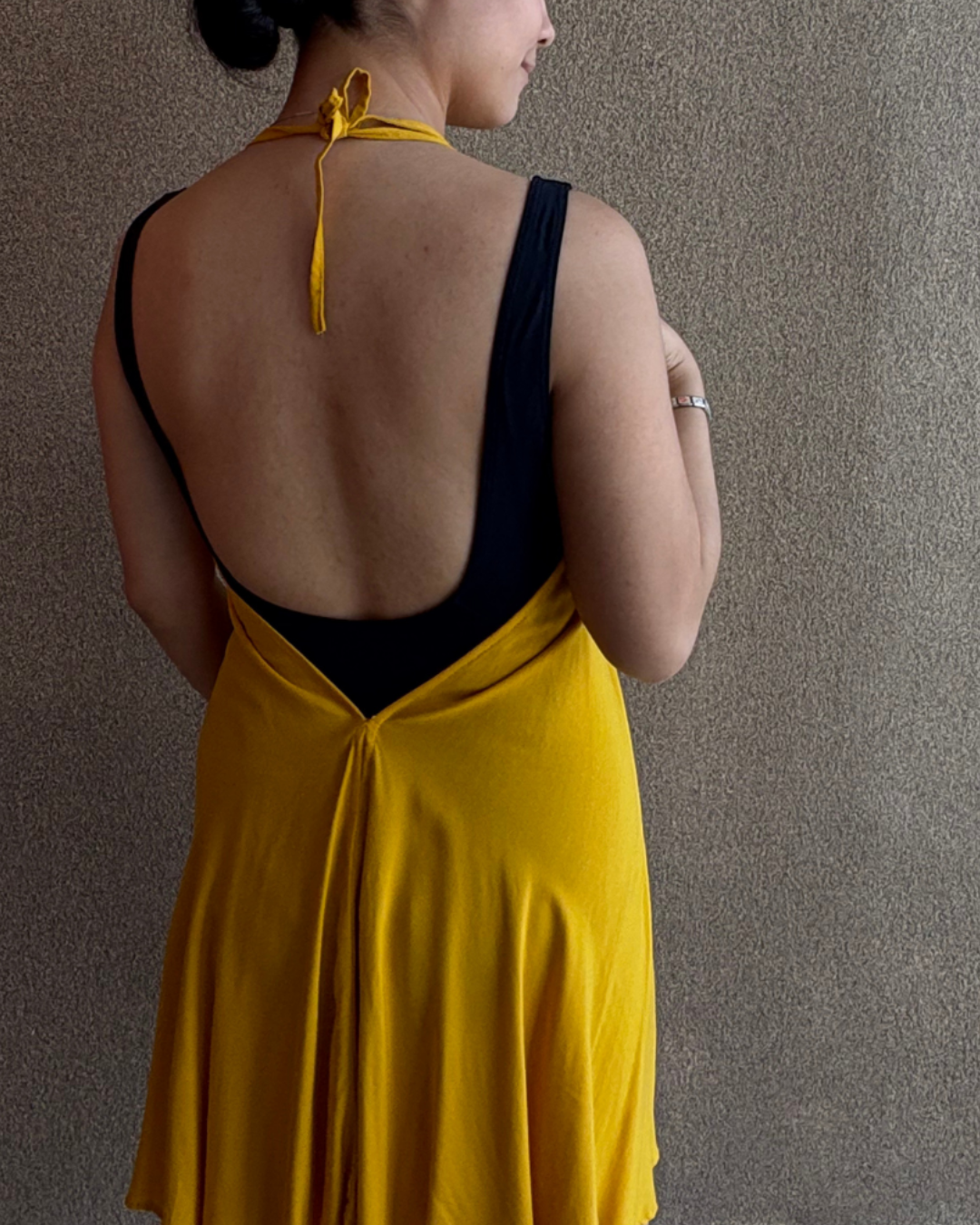 Vestido corto con cuello halter y corte en V, de en tela ligera