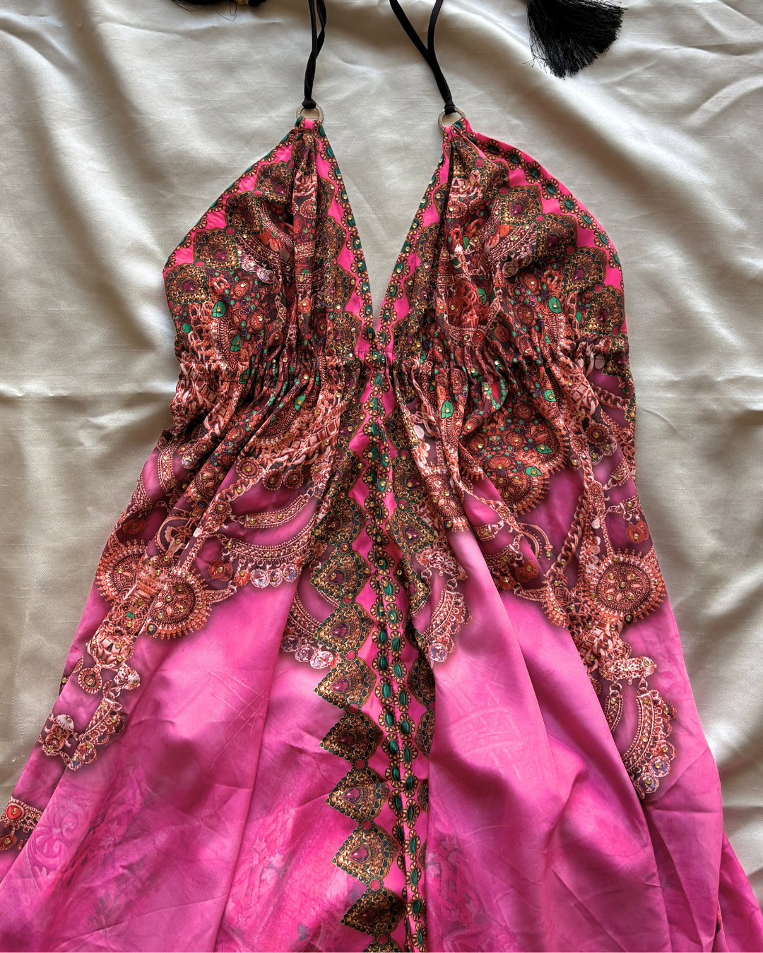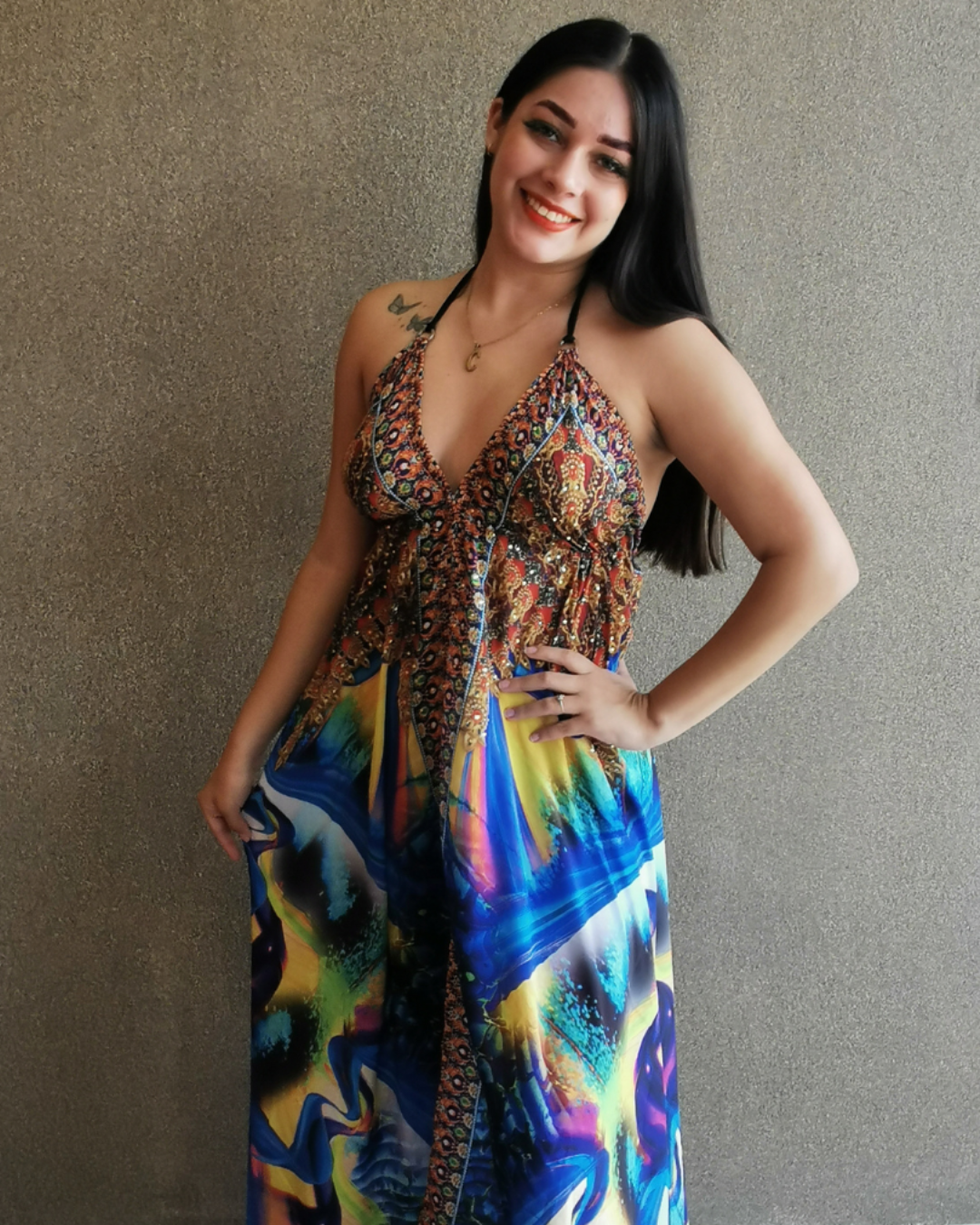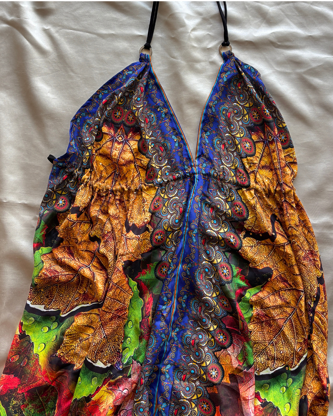 Vestido tipo halter de silueta suelta y fluida, con estampados en tonos vibrantes que aportan personalidad. Su diseño destaca por la libertad de movimiento y la caída natural de la tela, su silueta amplia favorece distintos tipos de cuerpo, ofreciendo comodidad y elegancia