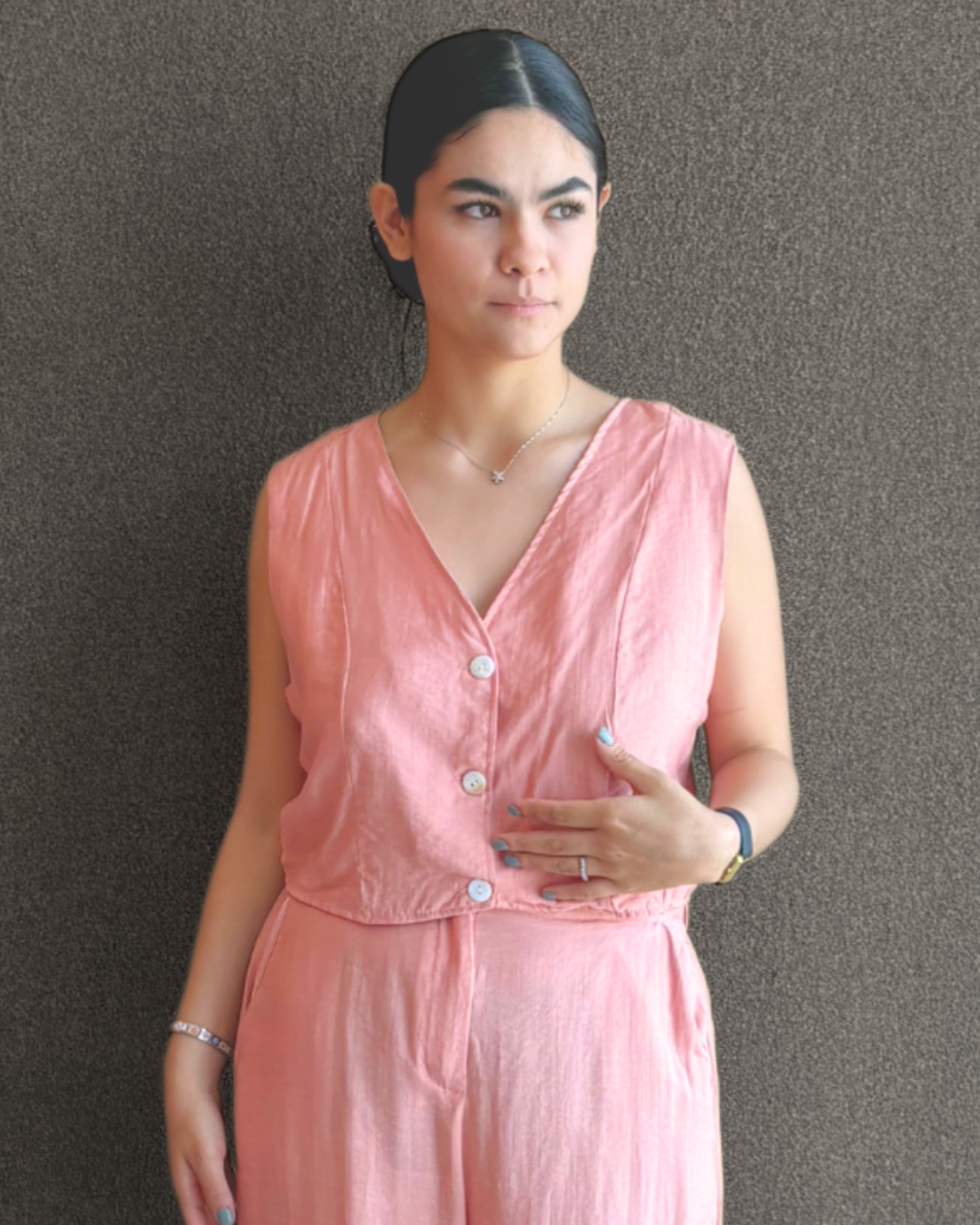 Conjunto coral en lino, pantalón amplio y top tipo chaleco con delicados botones frontales.