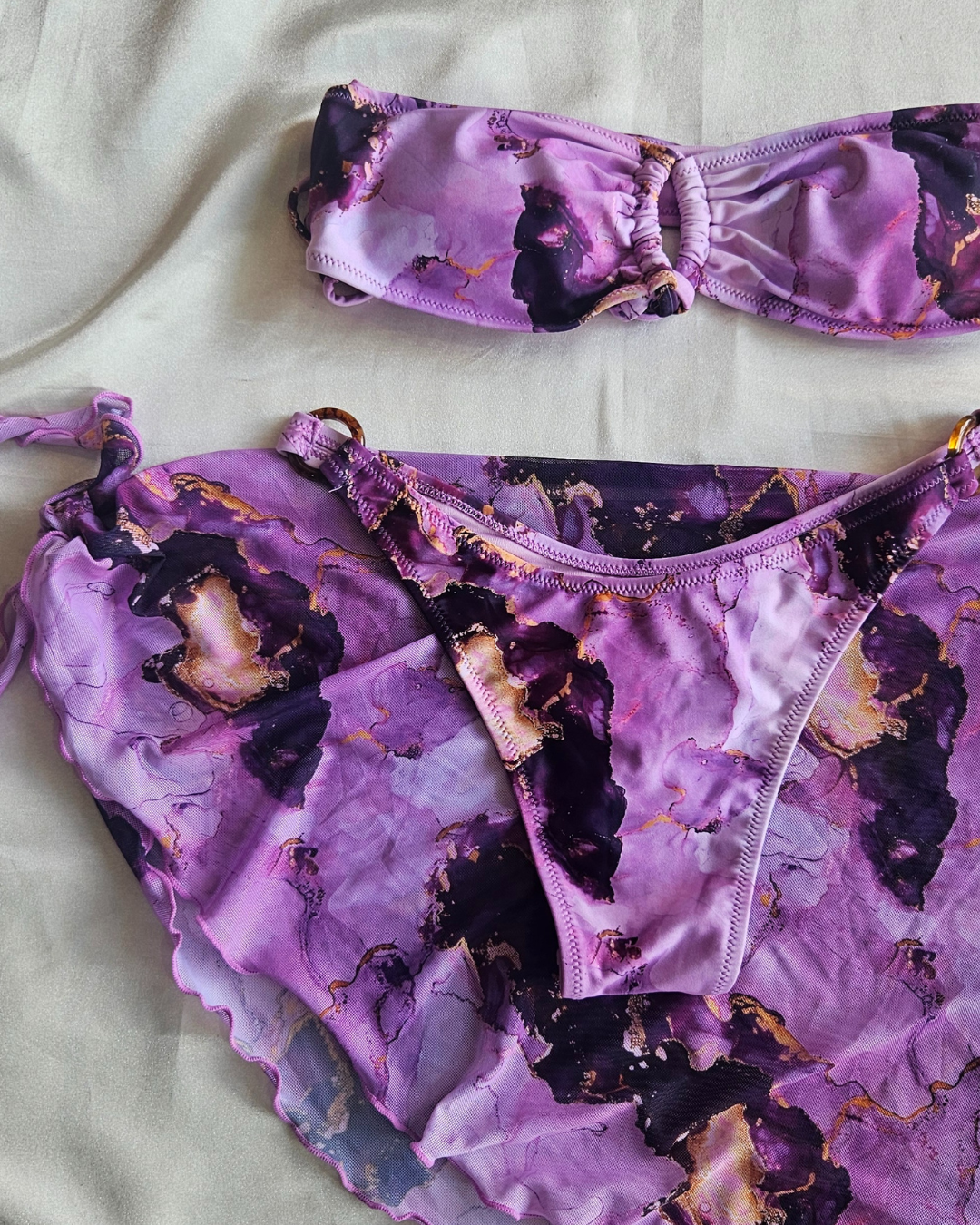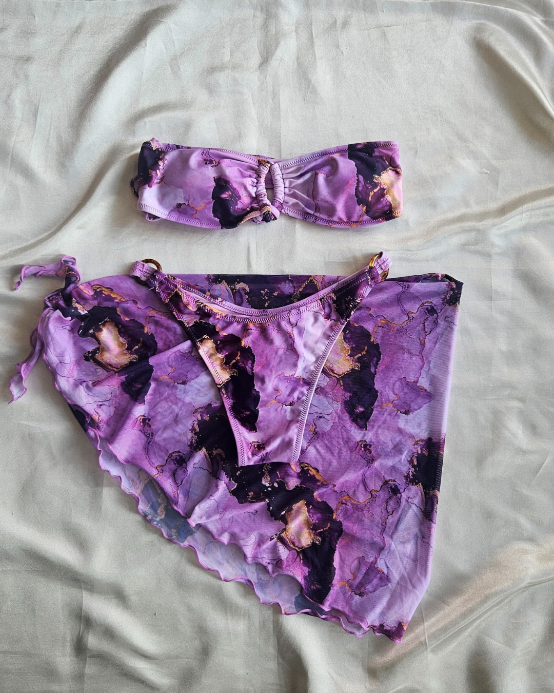 Top recto con amarre, calzón de pierna alta con aros laterales y pareo tipo falda que aporta estilo moderno.