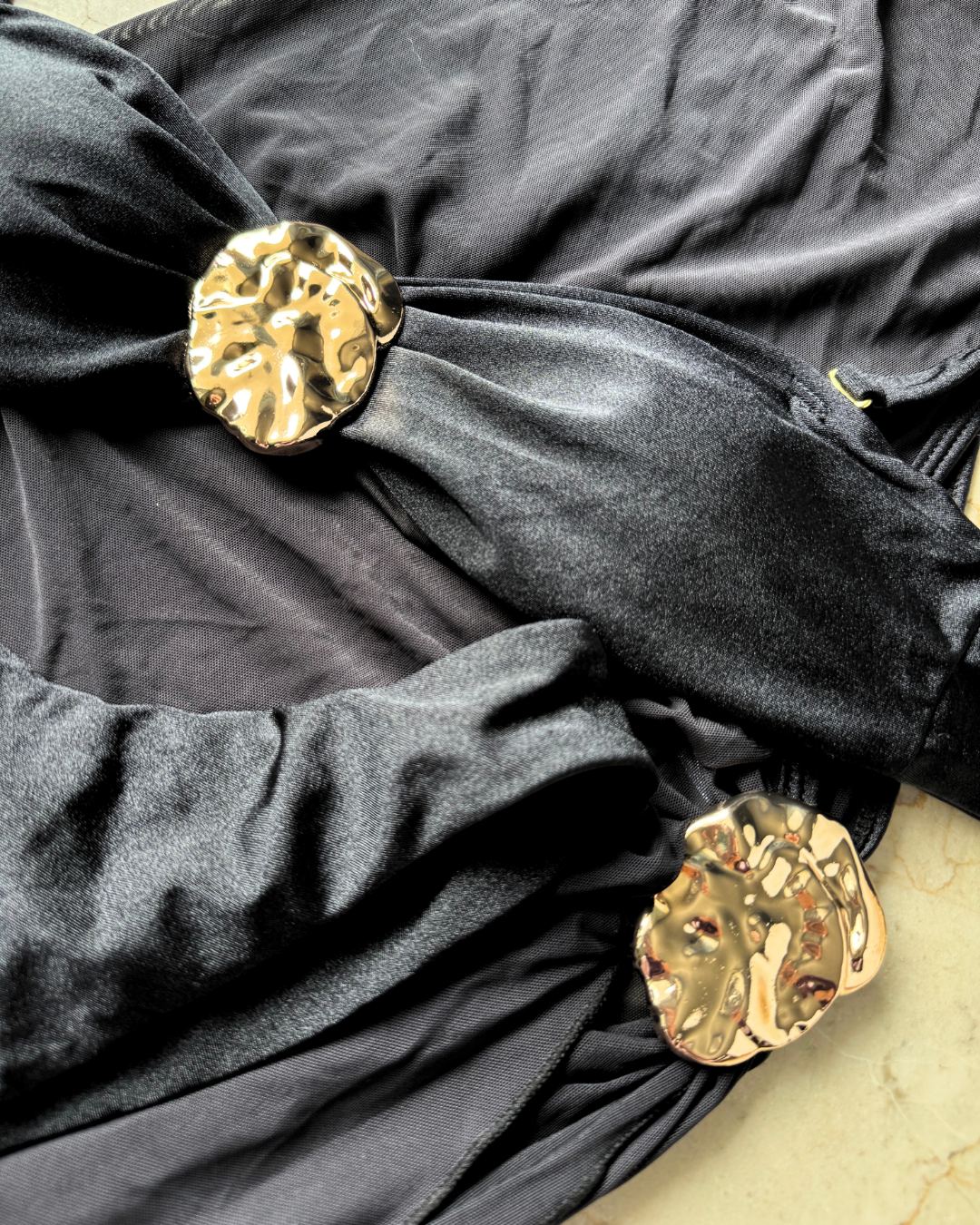 Hombro que se conecta con una falda larga, creando un efecto visual de vestido de noche para la playa. El conjunto está adornado con grandes broches metálicos.
