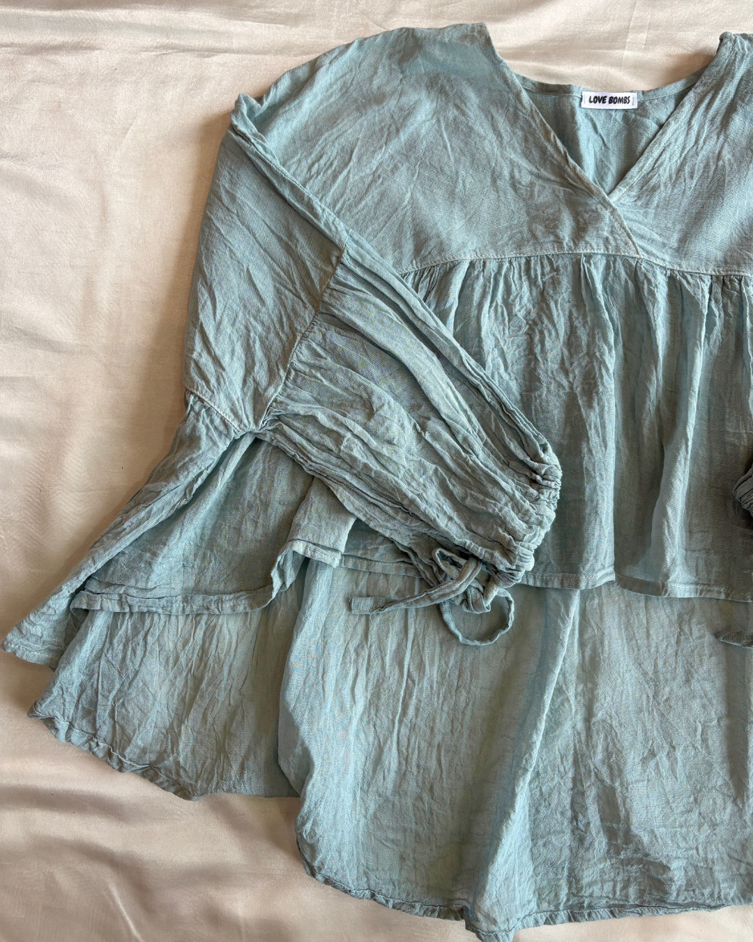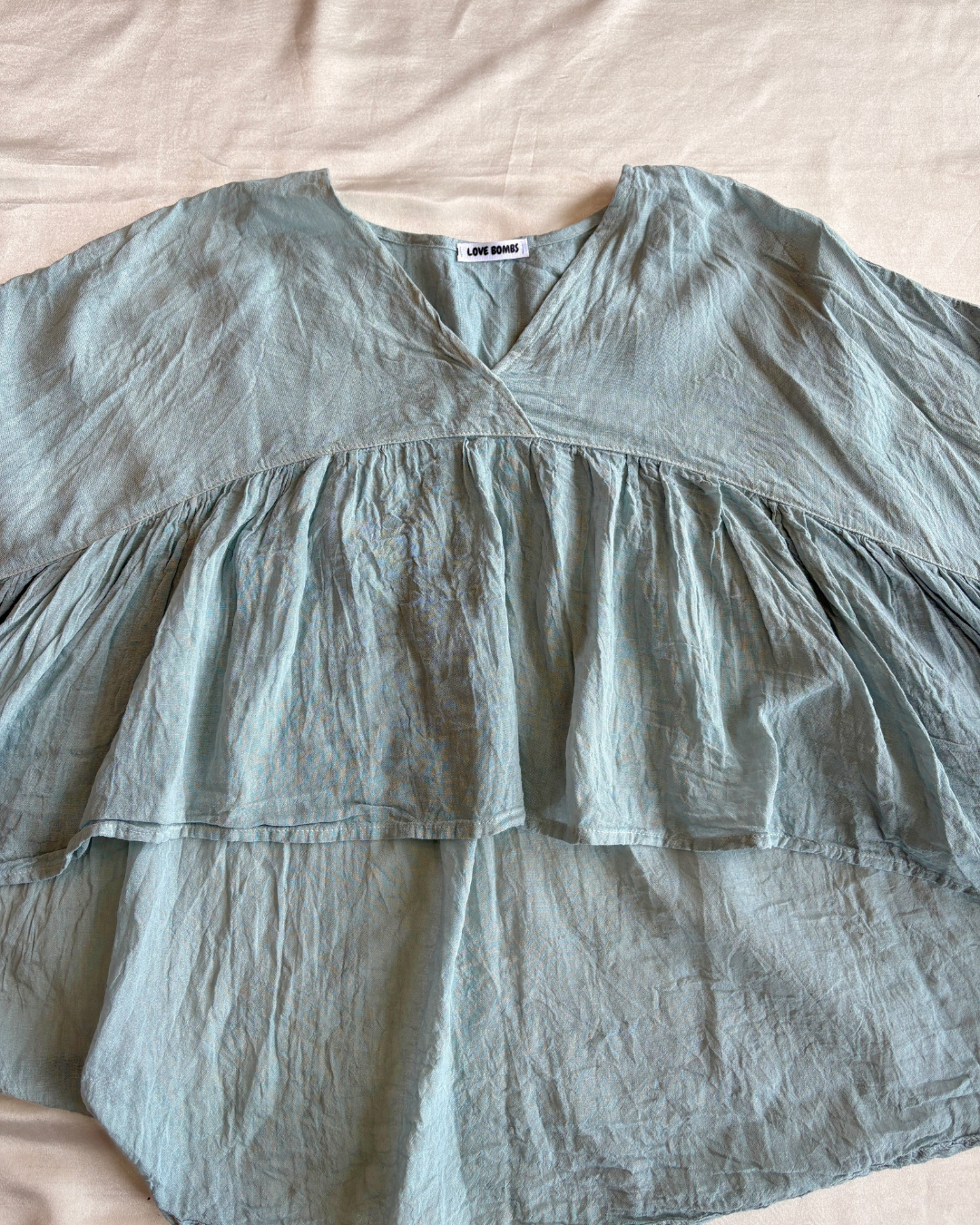 Blusa unitalla de tela fresca en diferentes colores con mangas acampanadas.