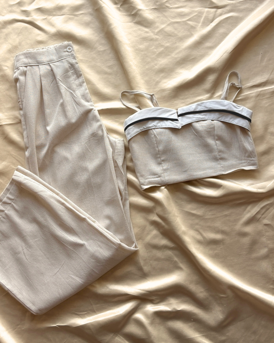 Conjunto beige en lino, top con franjas blanco y negro, y pantalón holgado, fresco y único.
